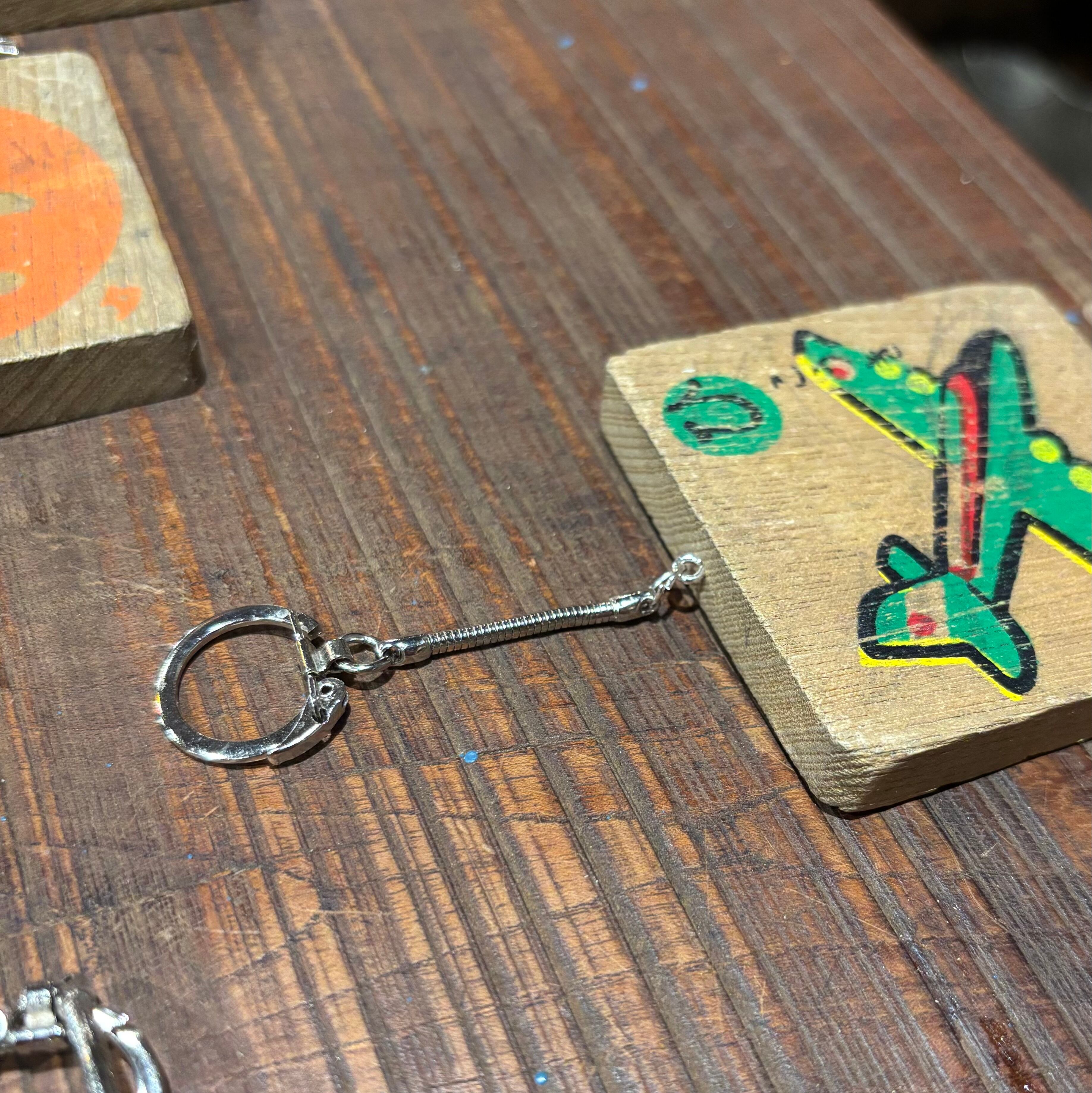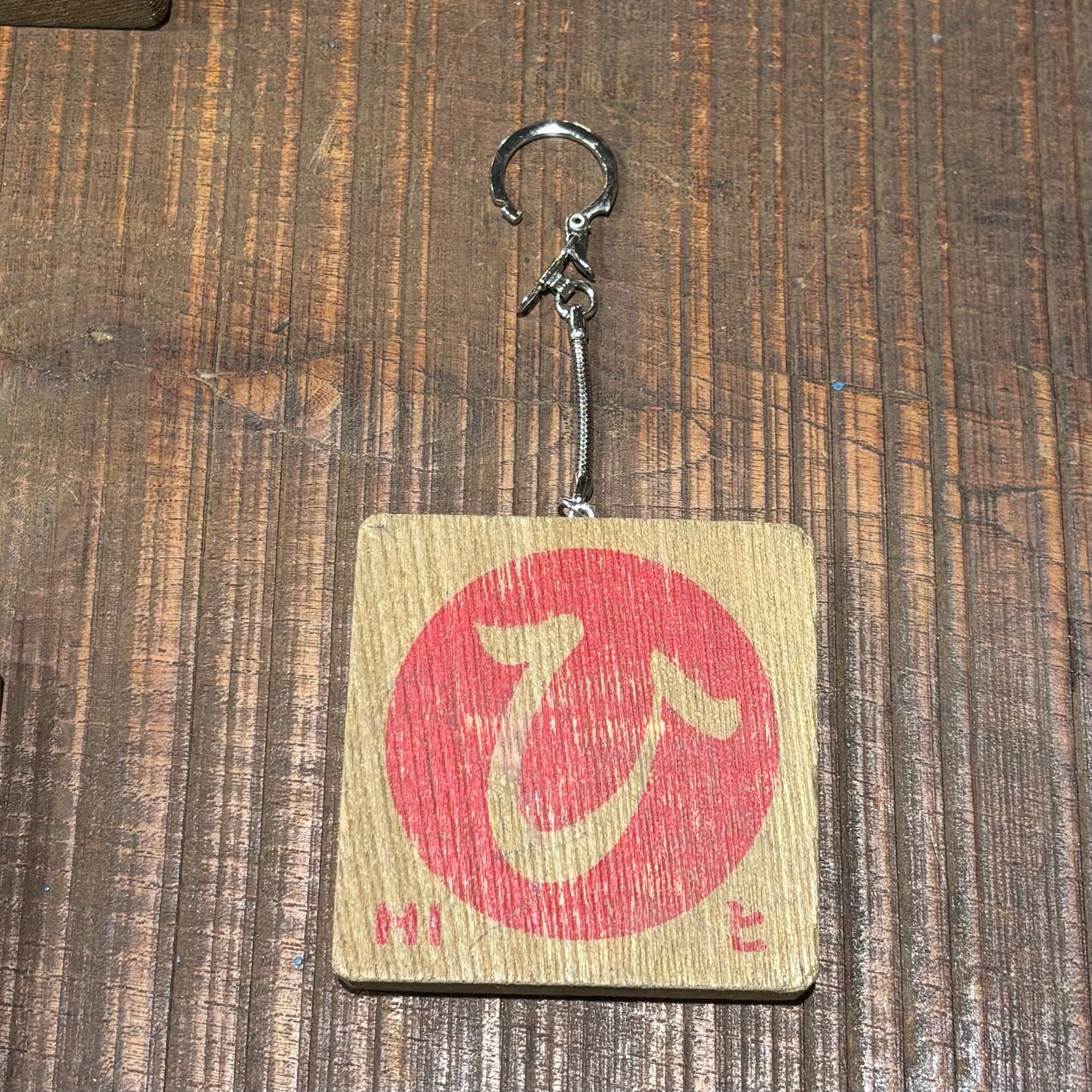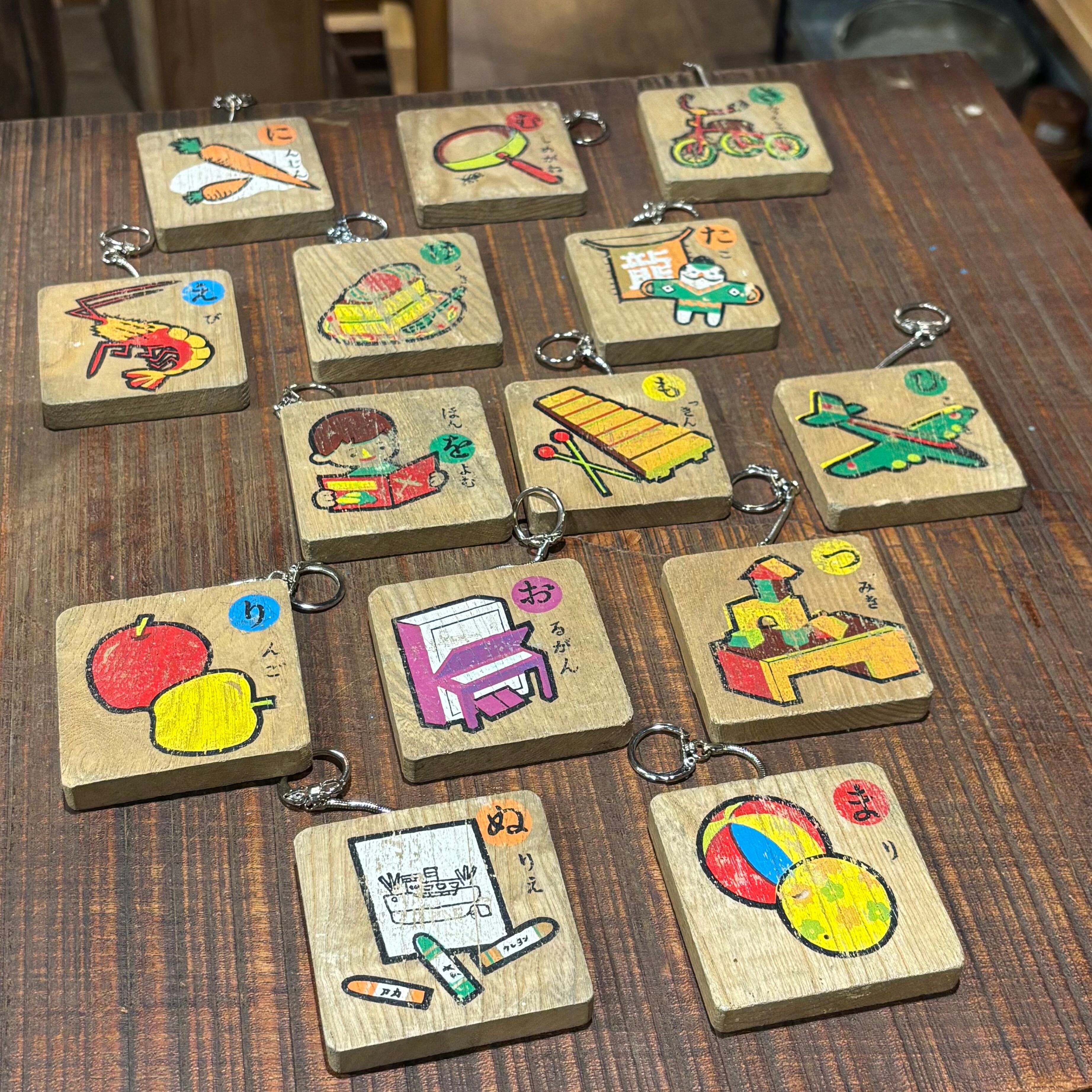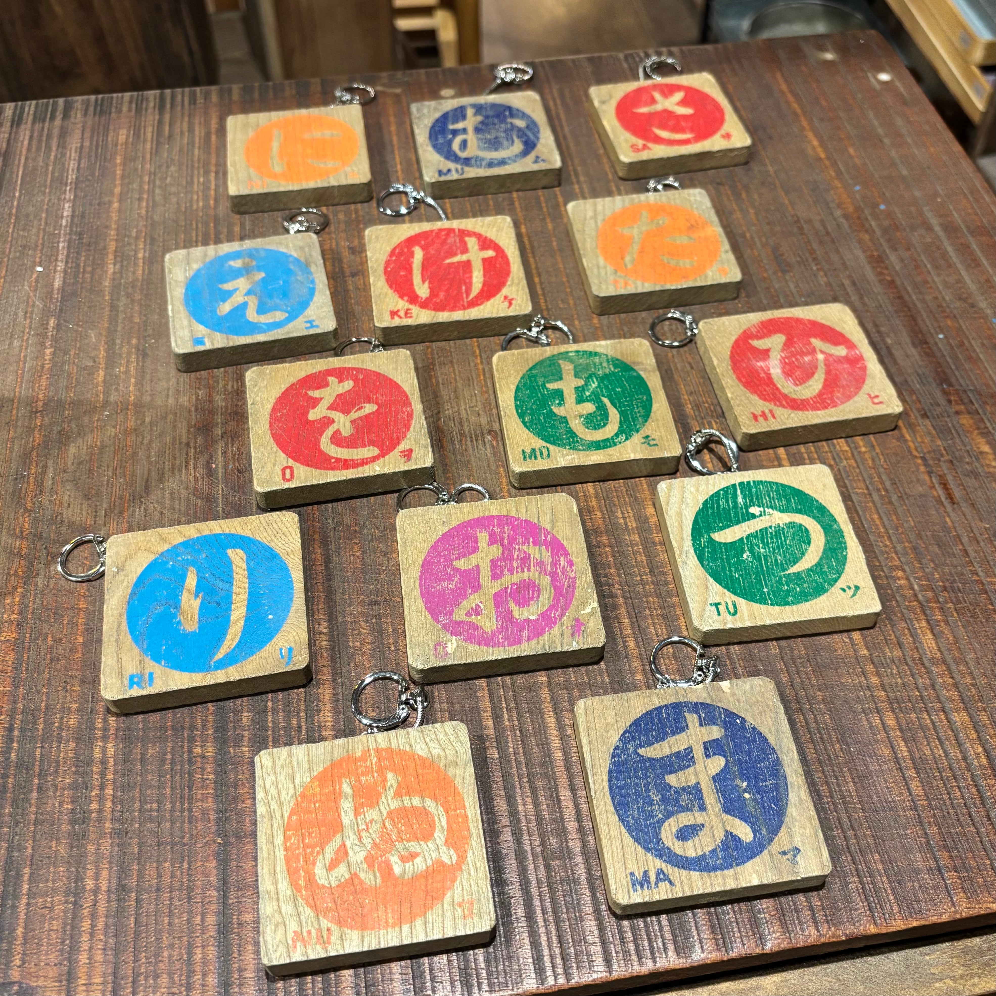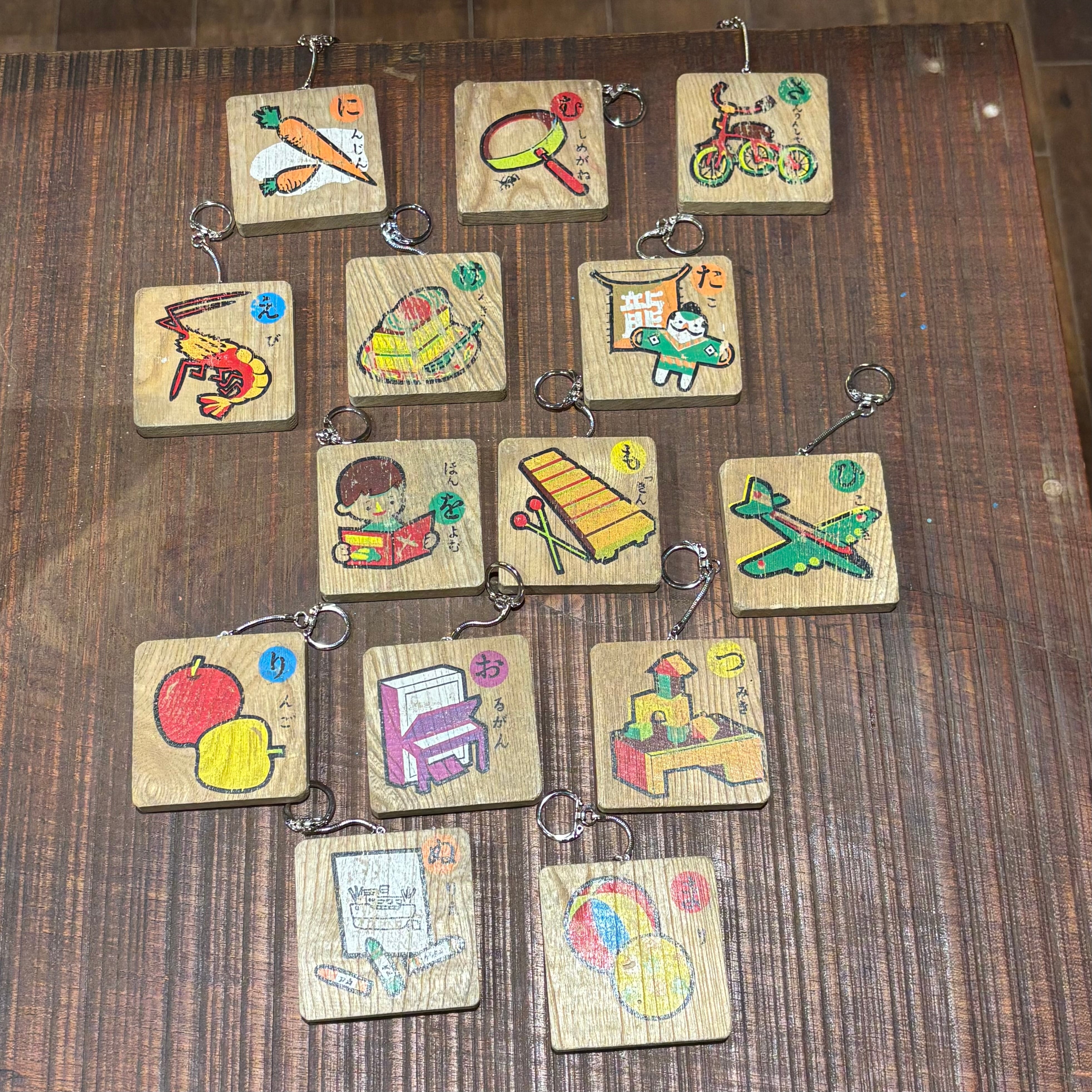 昔の木製ひらがなカルタをキーホルダーにしました カルタサイズ65×65mm キーホルダー長さ約60mm 古い物です 塗装が削れている物などございます