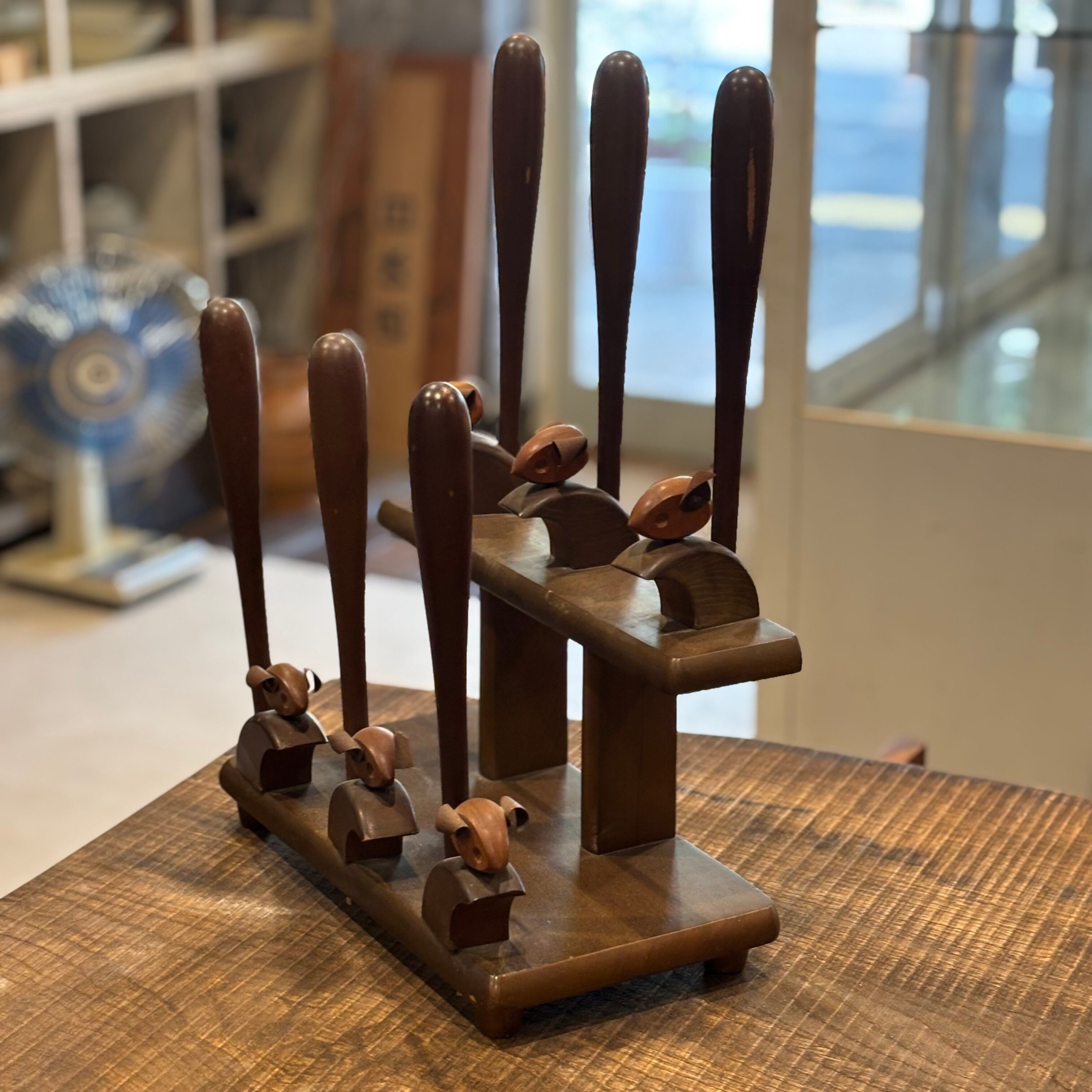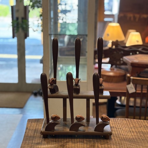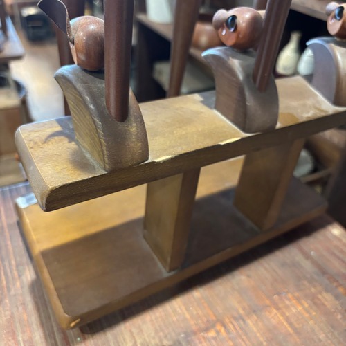 6足のスリッパを重ねて片付ける事ができます ネズミかリスかのモチーフです 木製 多少の傷はございます サイズW315×D170×H440mm