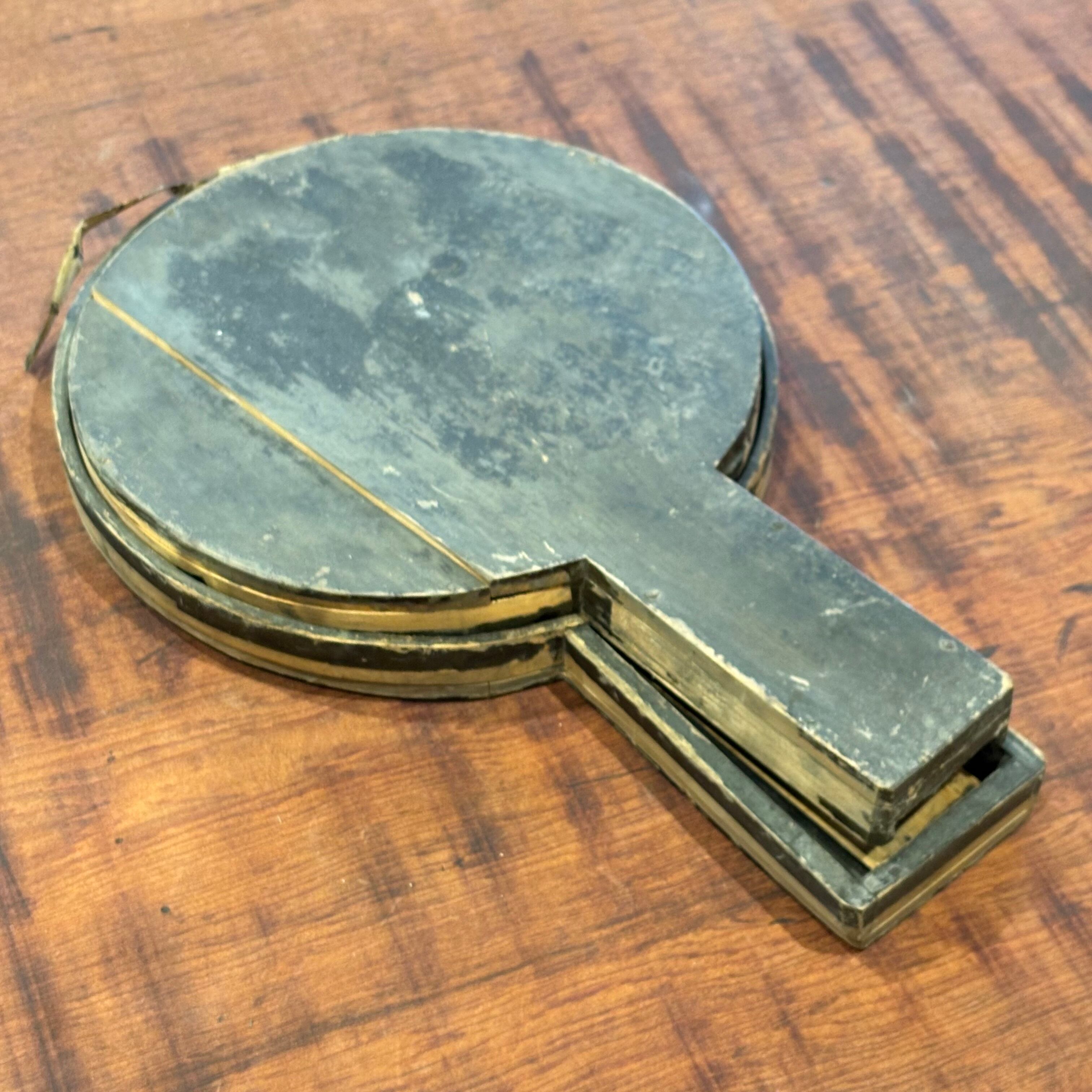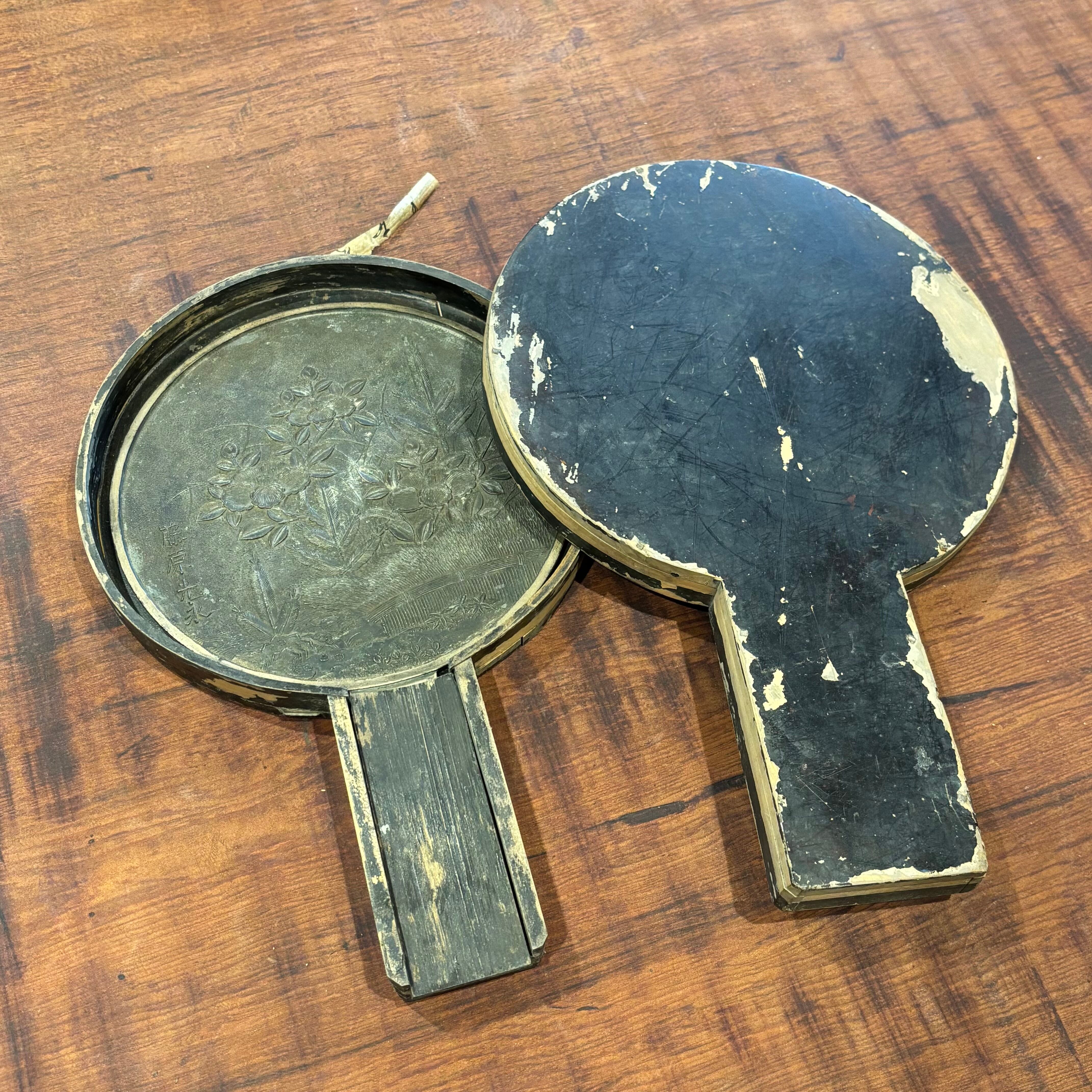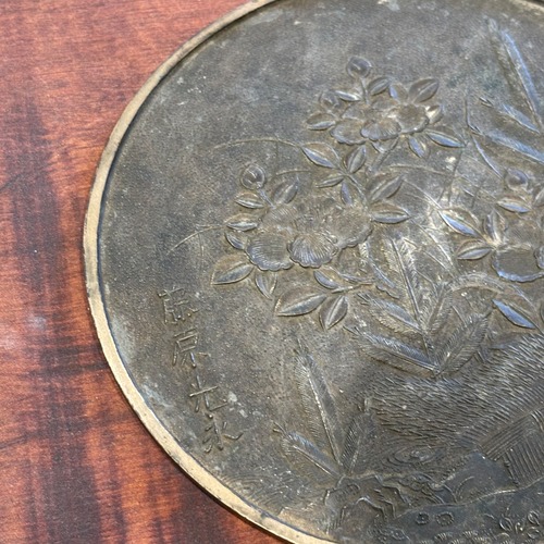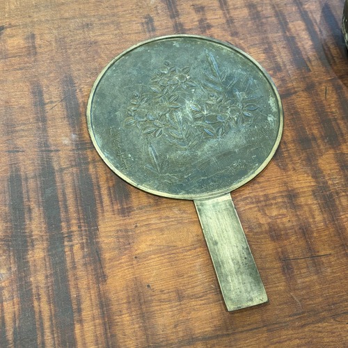 銅鏡 鏡面 古鏡 刻印は藤原光永とあります 椿の絵が装飾されてます 鏡と言ってもほぼ見えませんが 昔はこれで身なりを整えたりしていたのでしょうか ケースもありますが、上下で閉まりません ケースには剥がれ、割れ等ございますがとても貴重な物です コレクターの方いかがですか? 鏡直径約175mm ケース全体サイズW320×D210×40mm 沖縄、離島の方は通常の送料をご選択ください