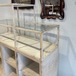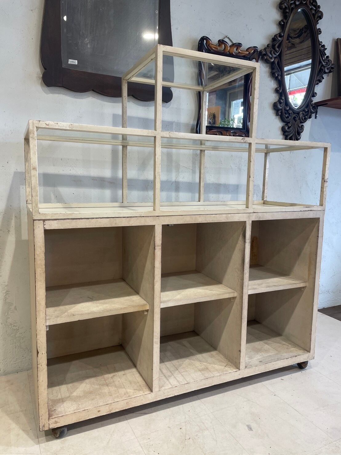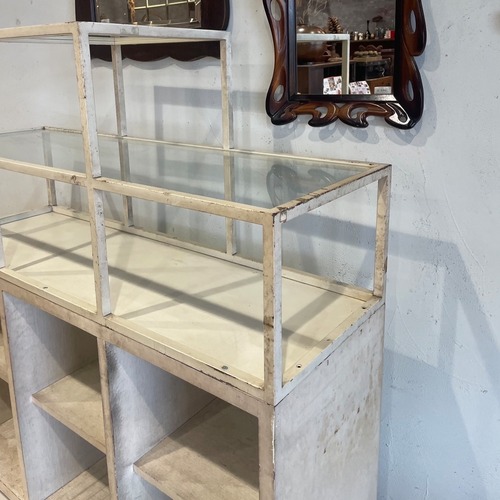 上2段はガラスの天板なので光が入り展示する物を綺麗に見せてくれます 上部のみ枠はアイアンです 古いシェルフなのでシミなどありますがいいシャビー感が出ております 店舗などの什器にもいかがでしょうか? サイズW1200×D400×H1310mm