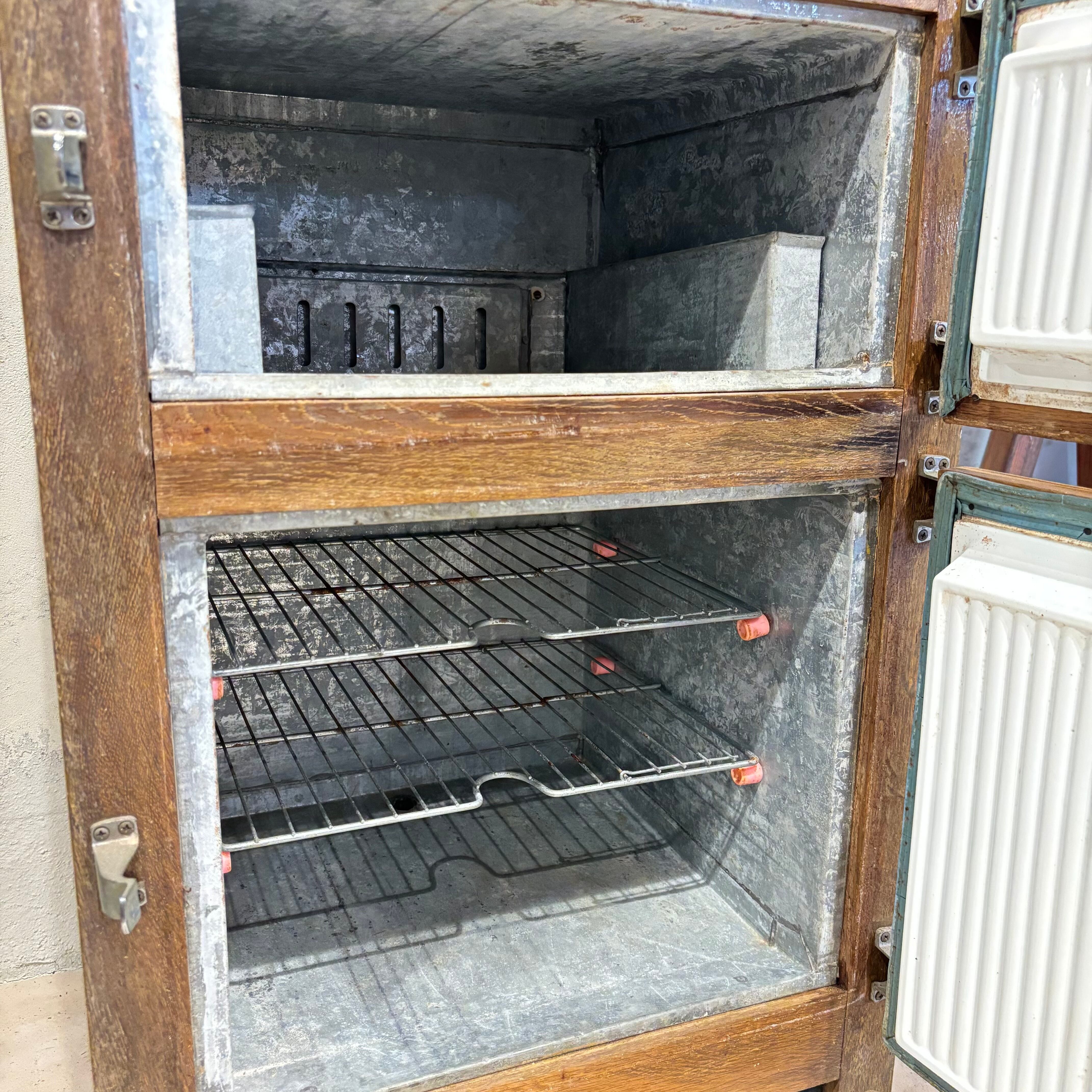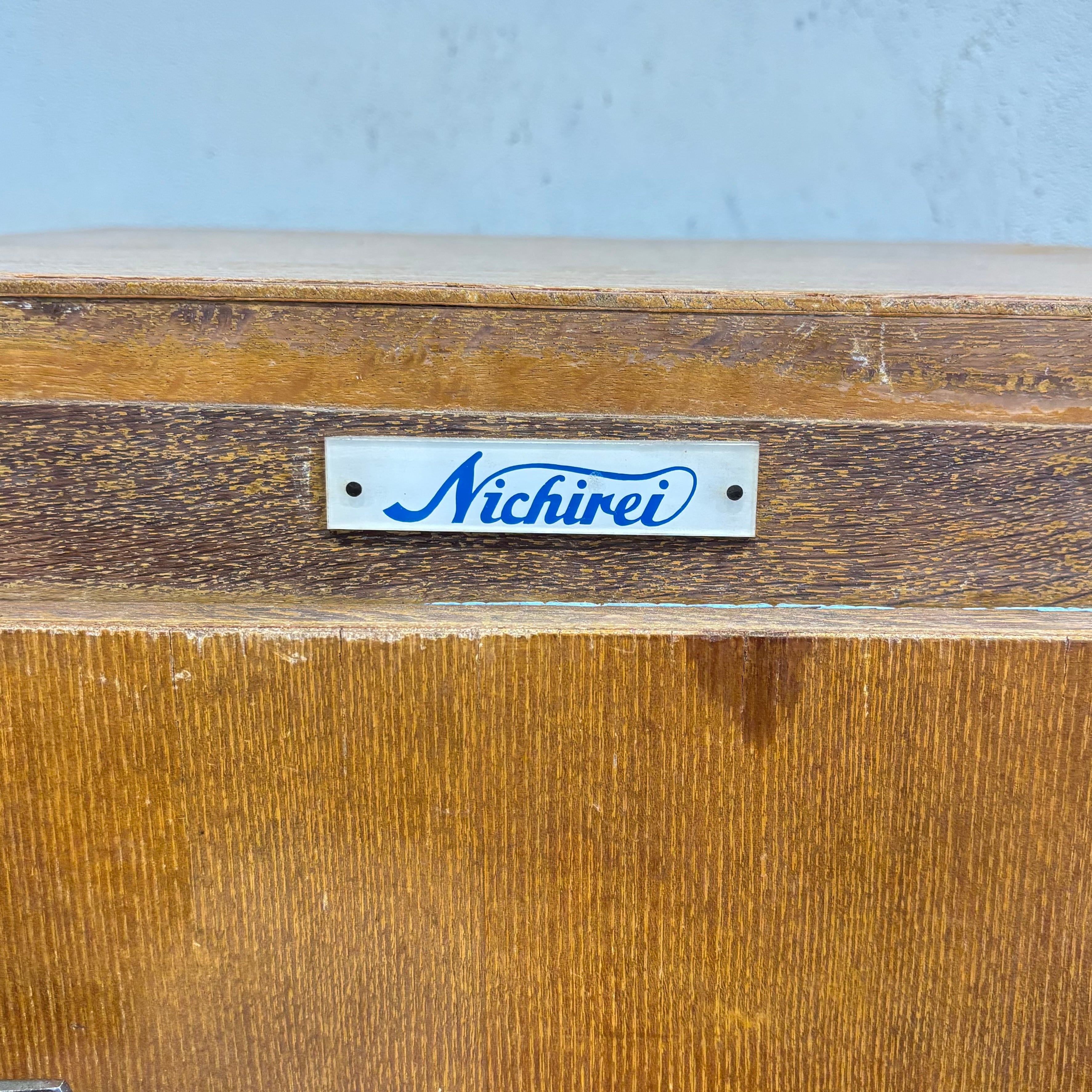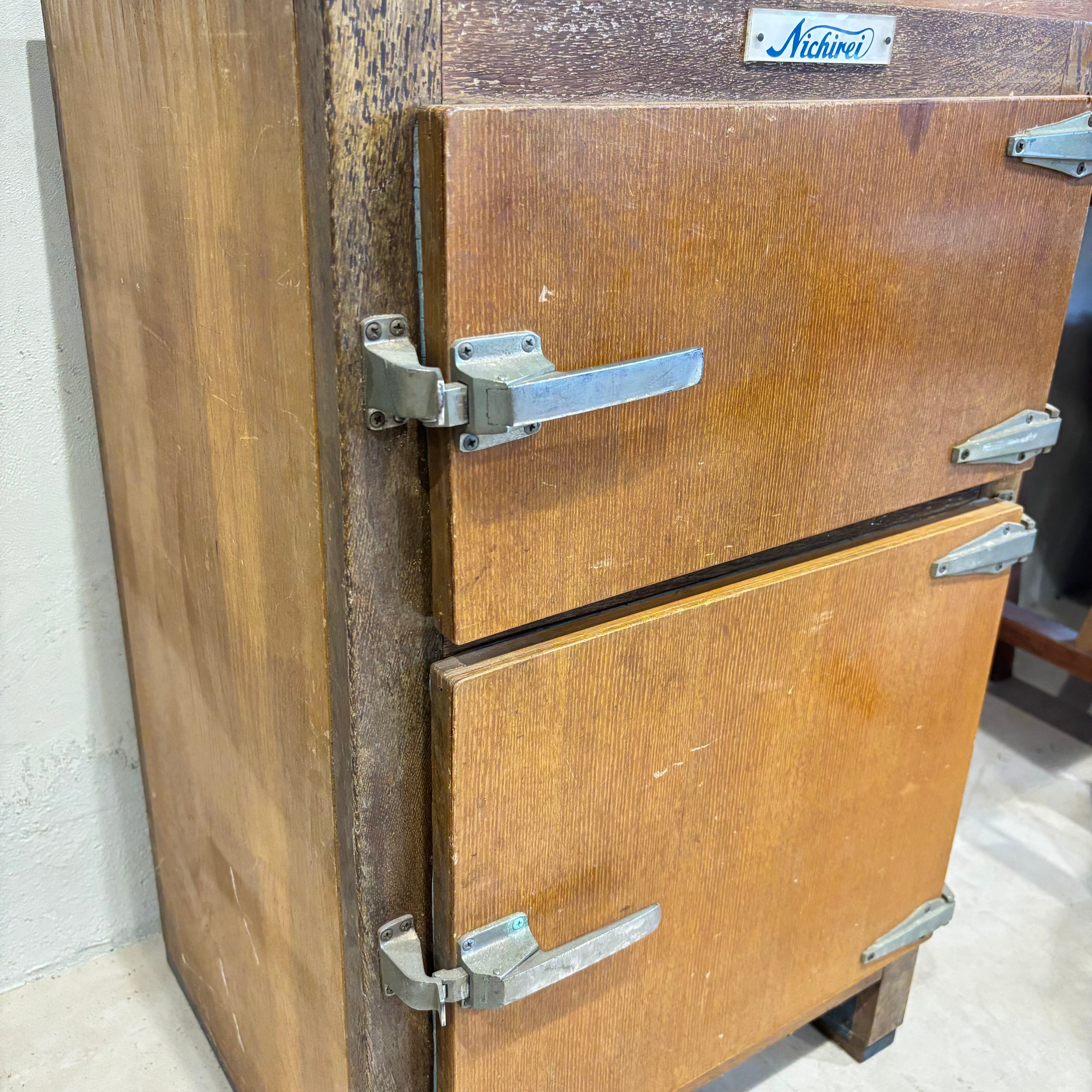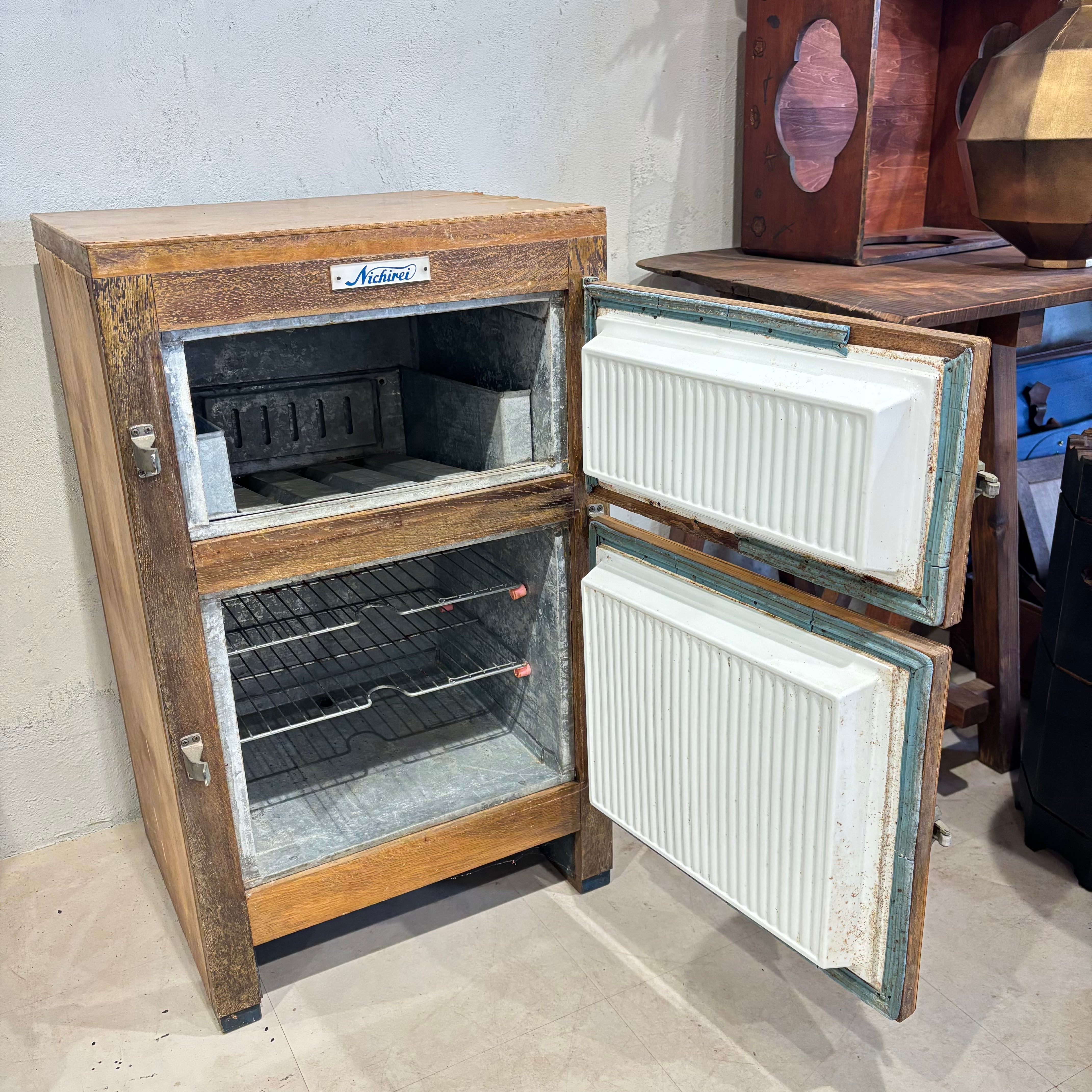 昔の冷蔵庫です 上部に氷を入れて下部を冷やす作りです ホースがないので冷蔵庫としては排水ができないので収納としてお使いいただけます 天板は多少の劣化で剥がれ等ございますがまだまだ状態はいいです W467×D440×H780mm