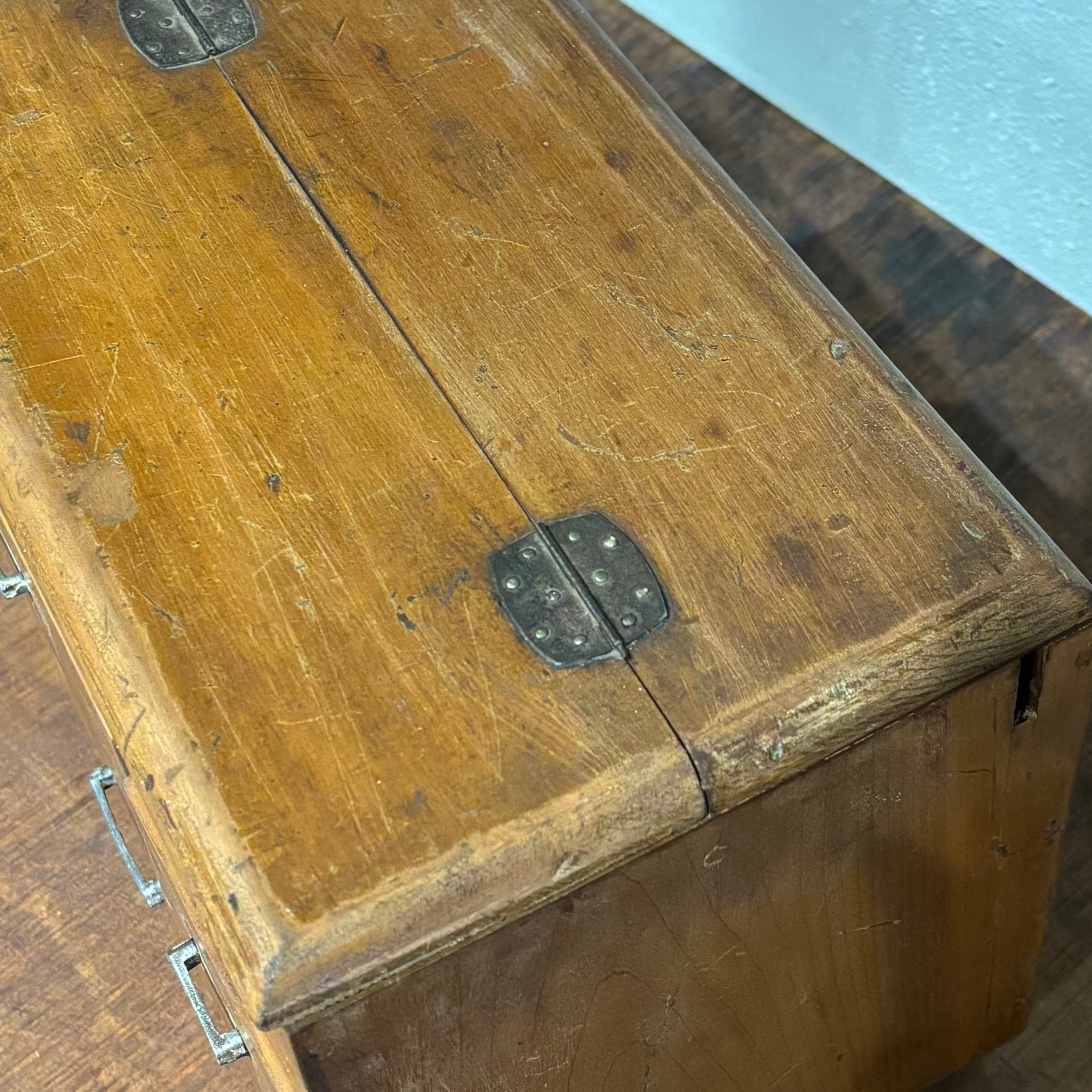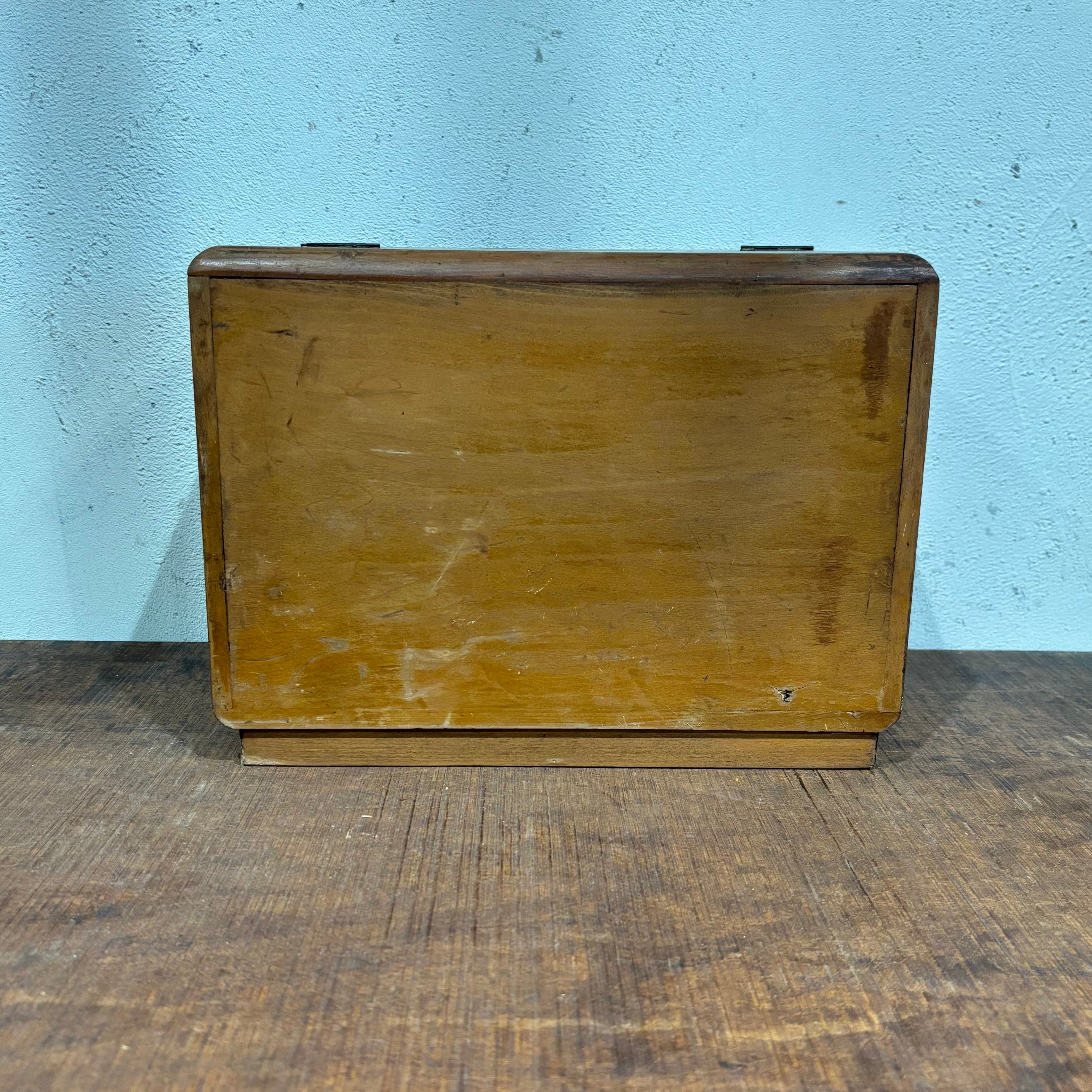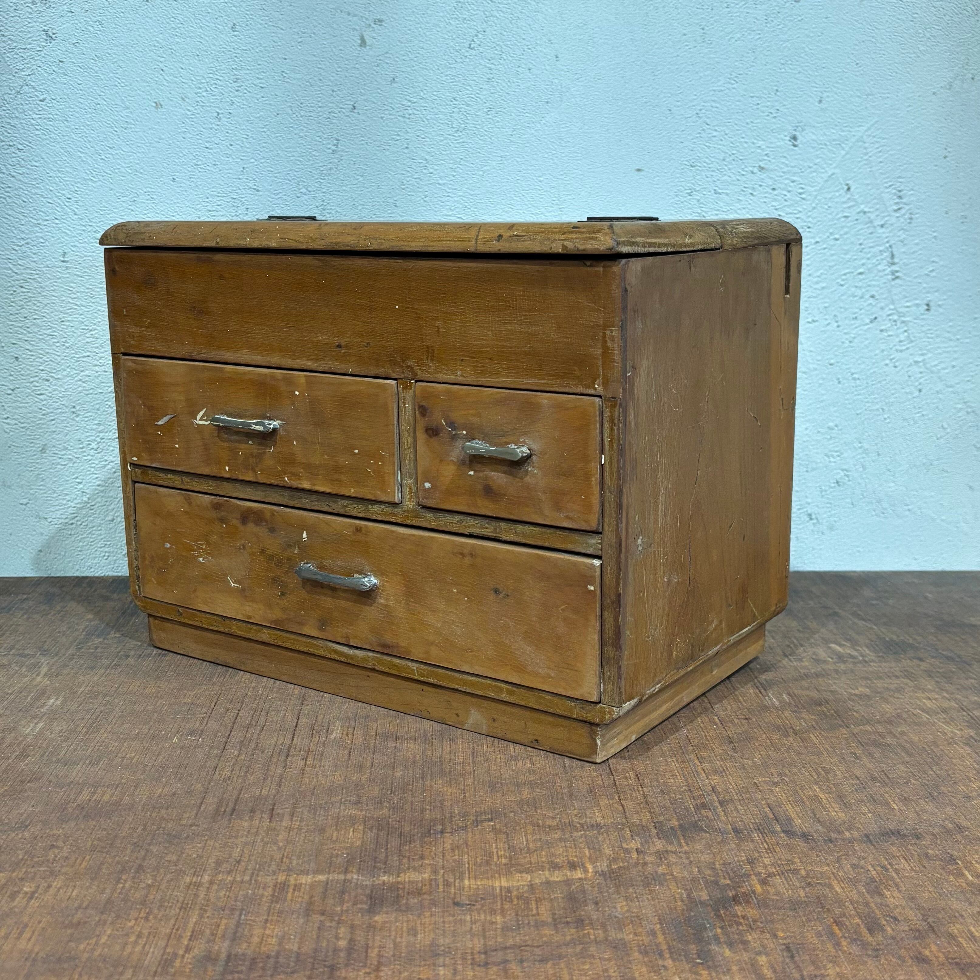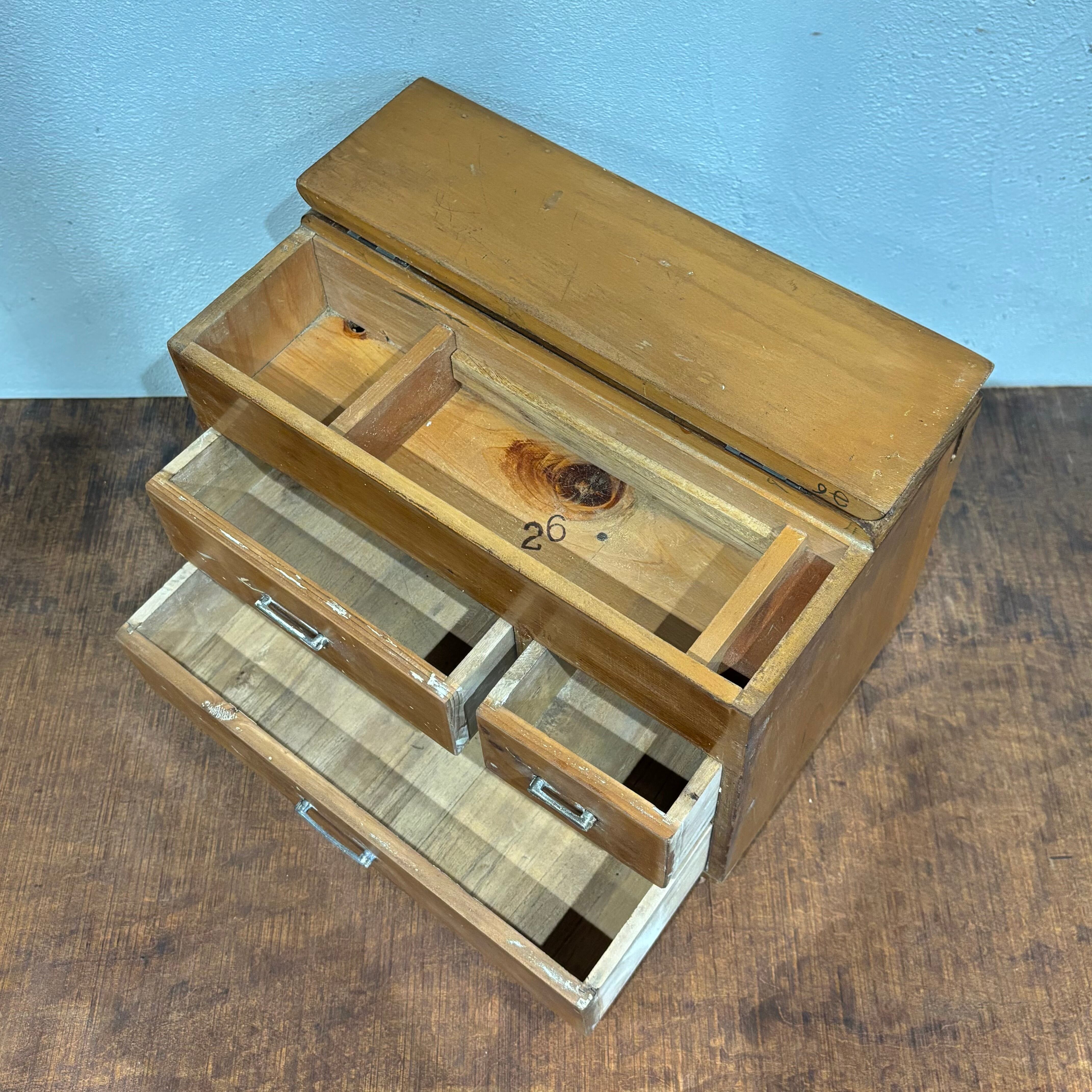 昔の裁縫箱です 小物入れなどにいかがでしょうか? 内部には26と印があったり、塗装がついている部分もあります 一番下の引き出しは背板がなくなっていたので新たにつけております サイズW285×D175×H220mm