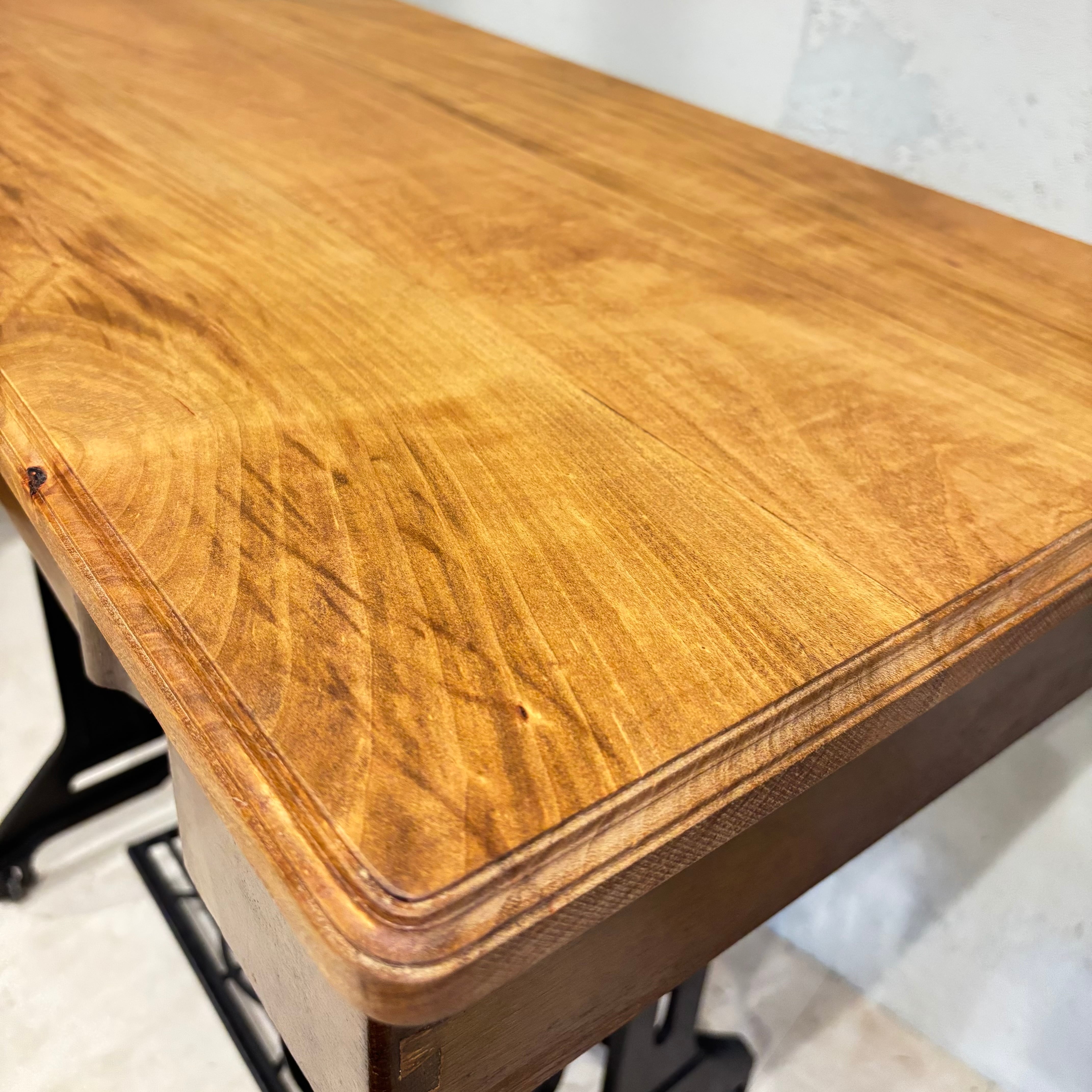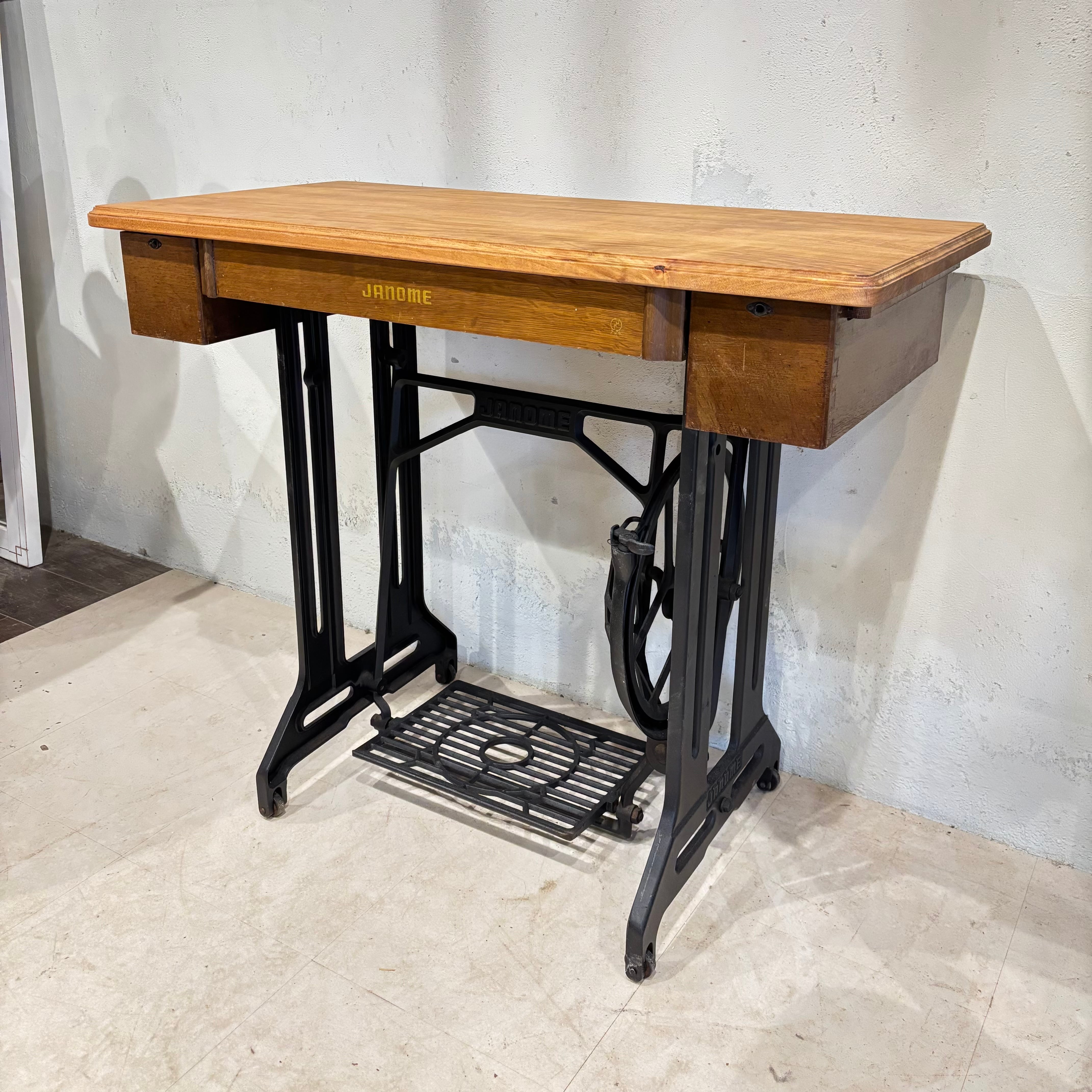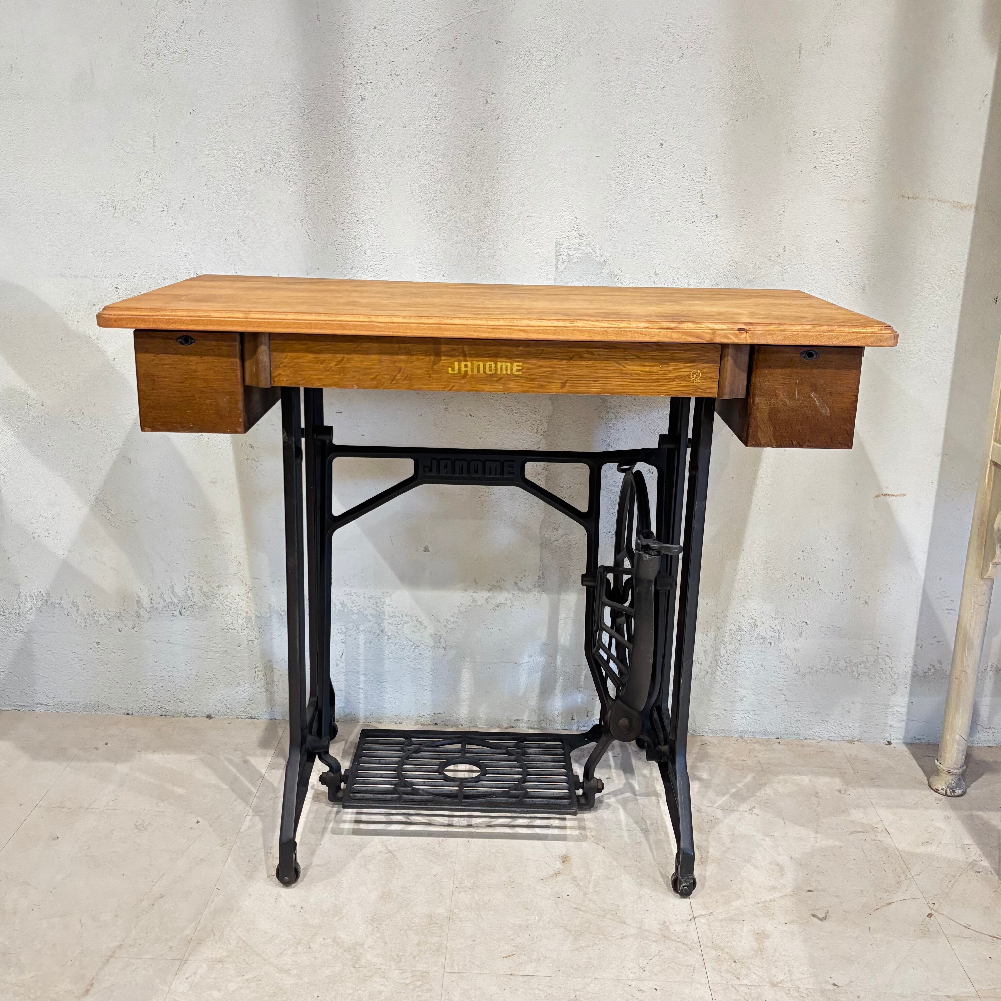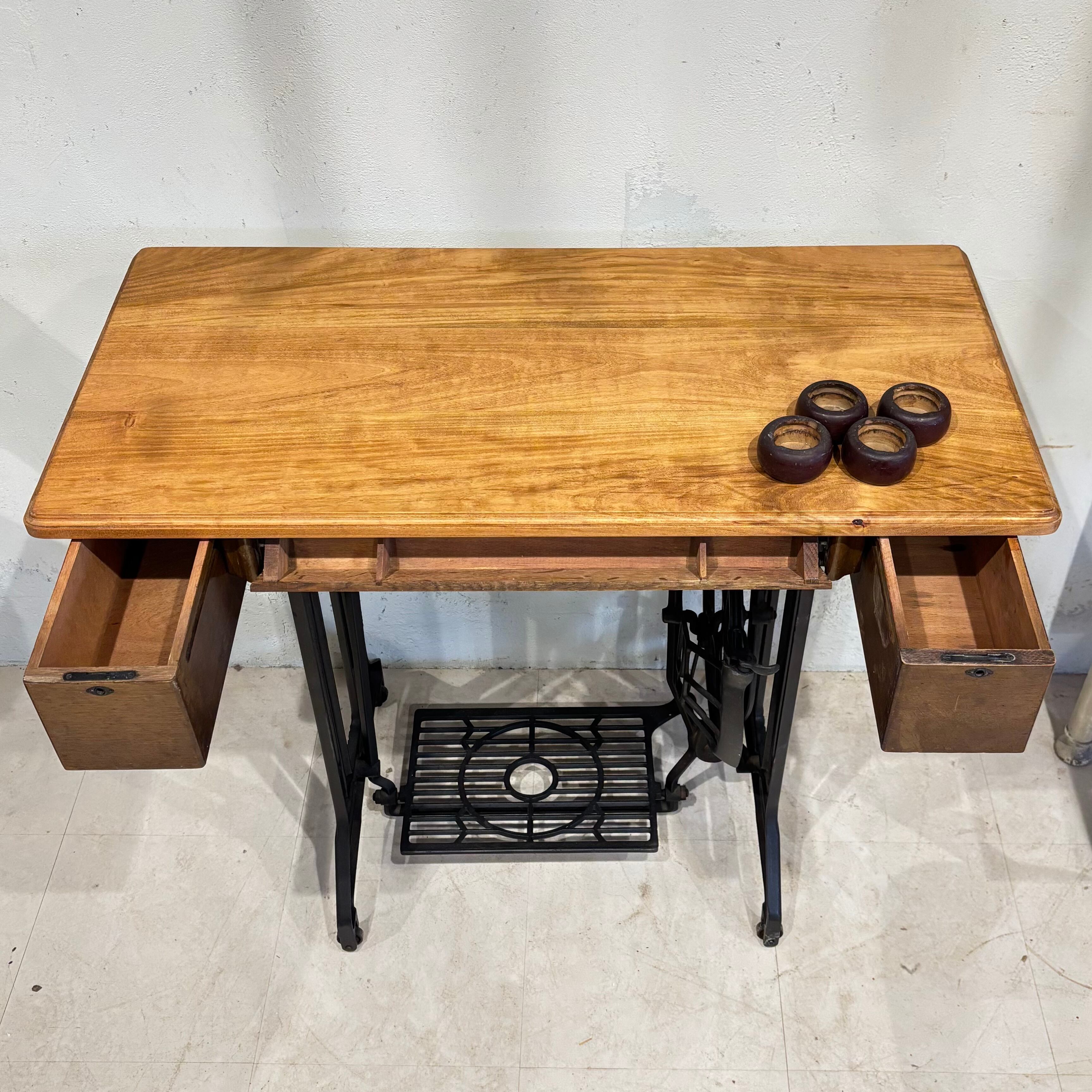 ミシン台デスク 古いミシンを天板を張り替えデスクとして生まれ変わらせました 古材の天板は味のあるデザイン 引き出しや足踏み部分はそのまま残しております 足踏みはちゃんと動きます 脚キャップ付き サイズW880×D430×H740mm