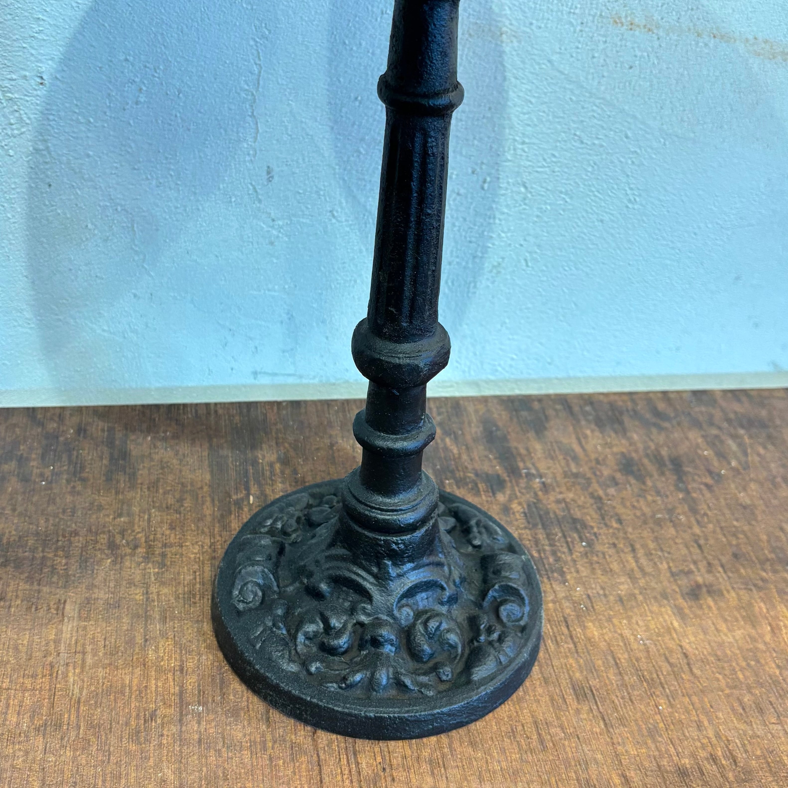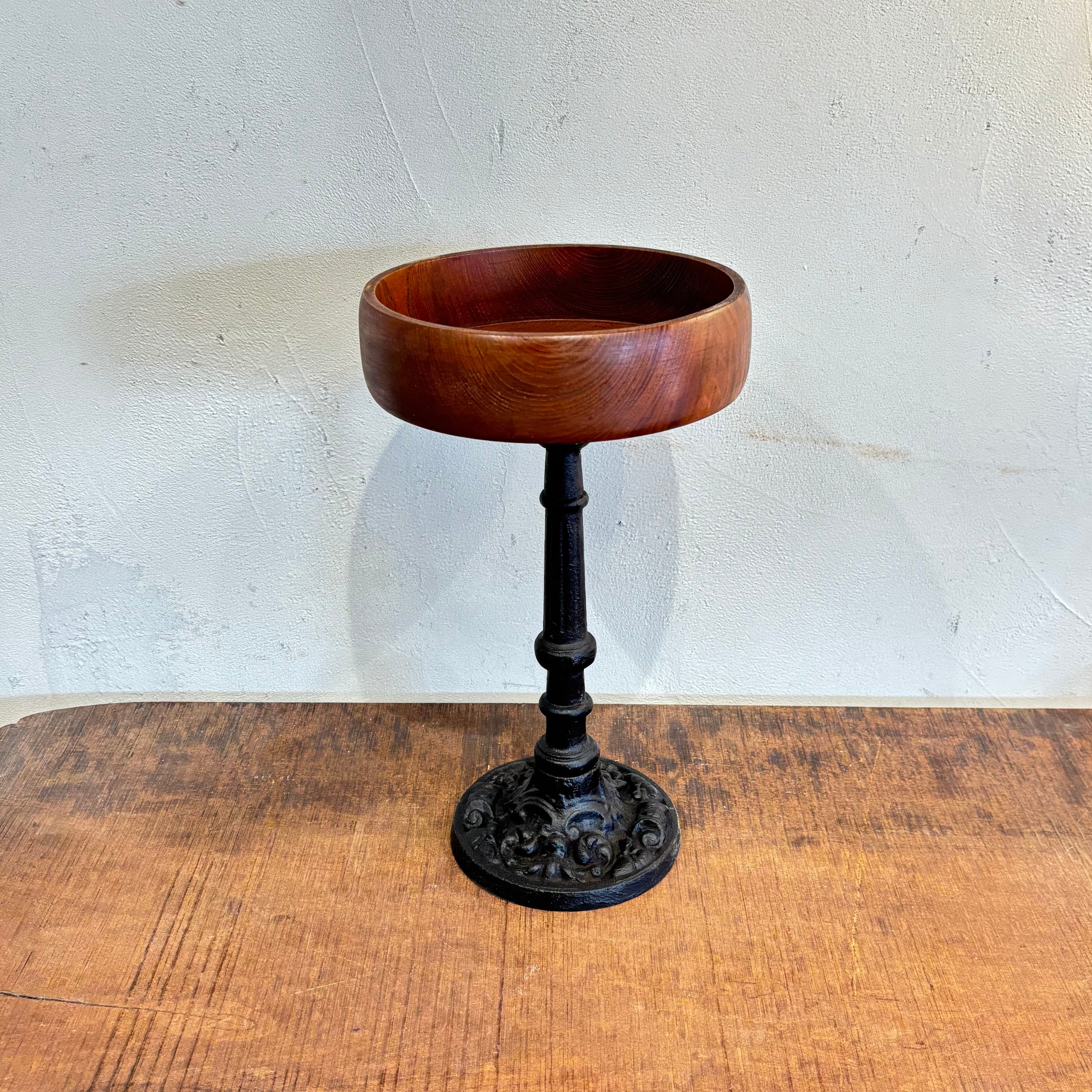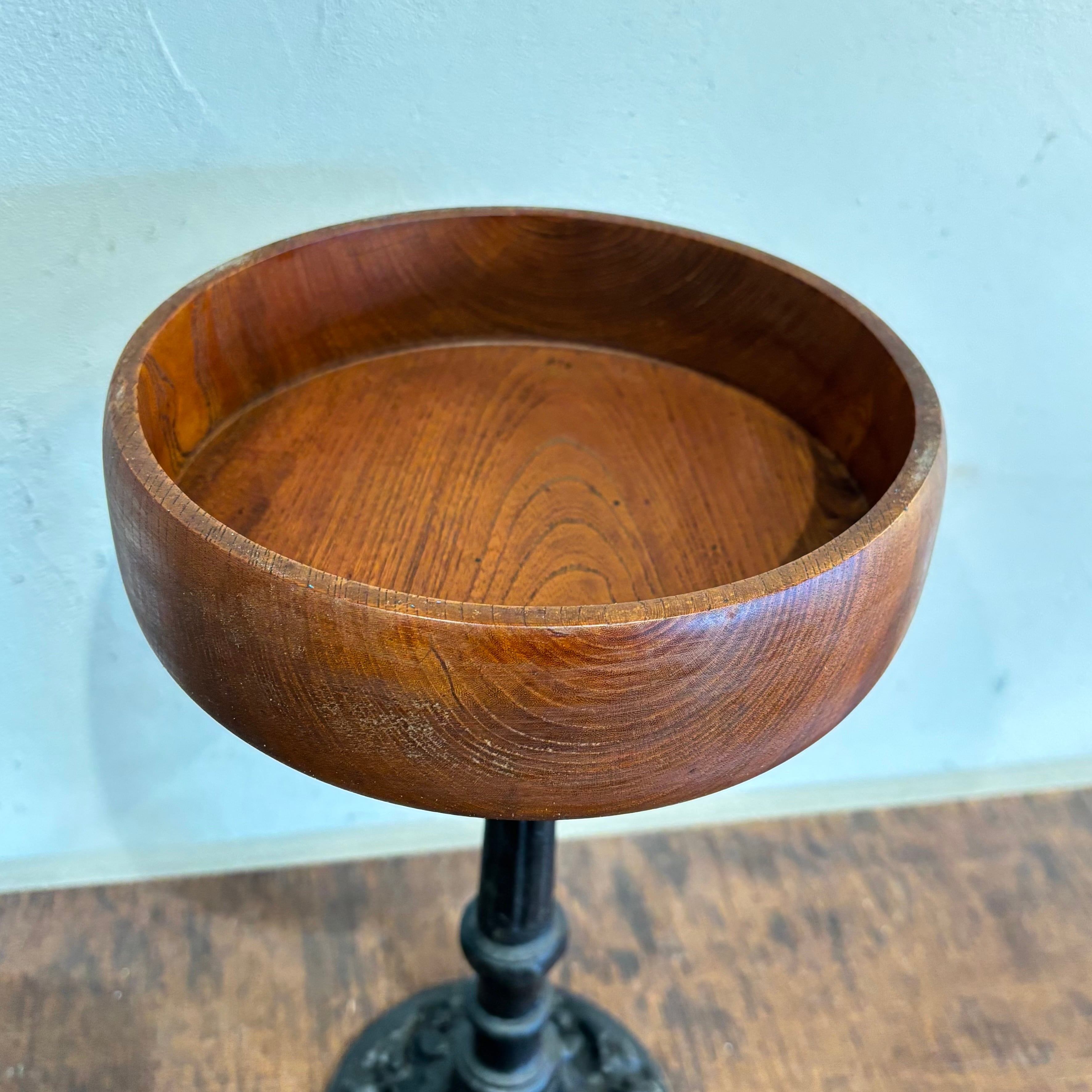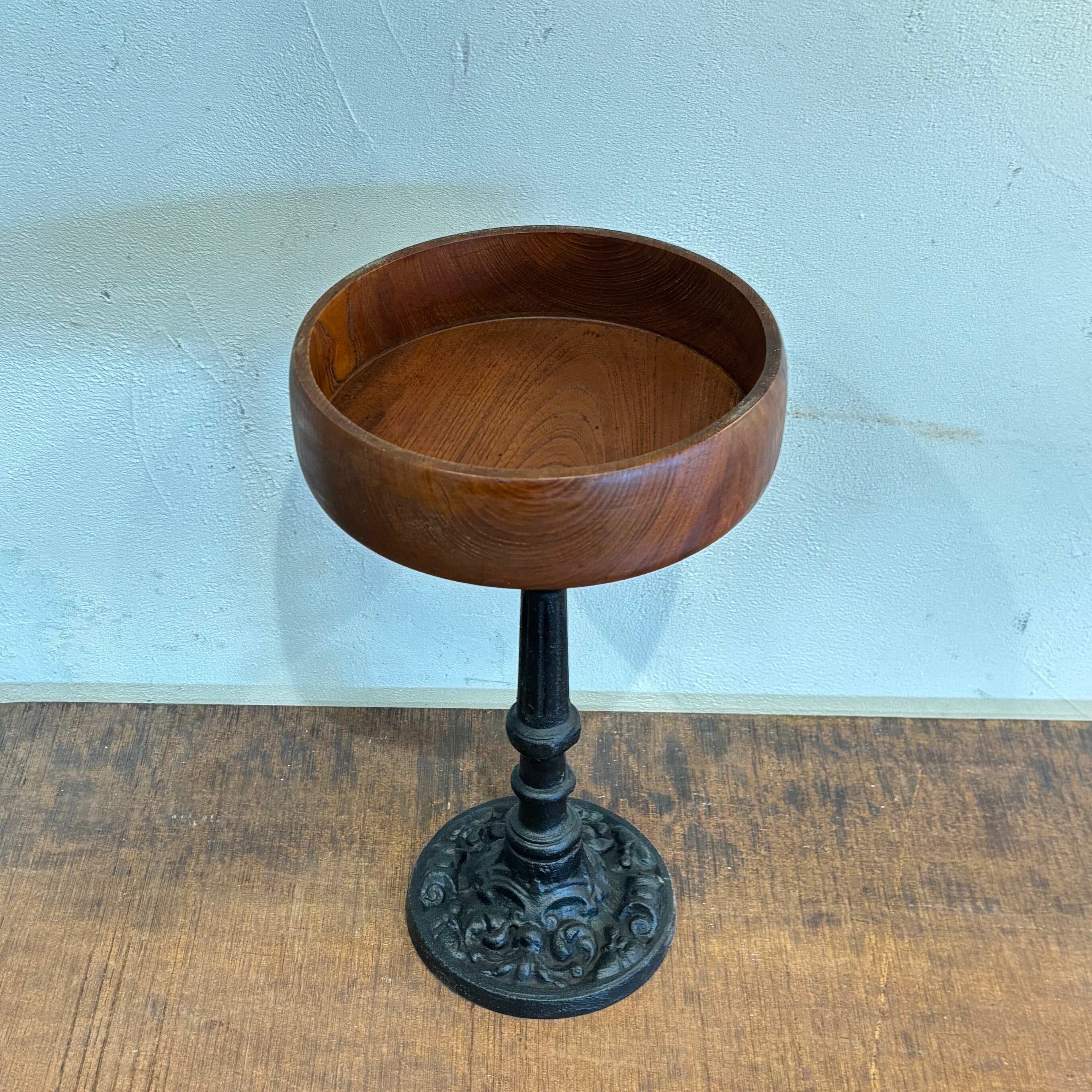 異素材の組み合わせの展示大丈夫 アイアン脚はずっしりと安定感あり トレイ部分は無垢の良さが出ております 鉢植えを置いたりインテリアにいかがですか? サイズ高さ約350mm トレイ部分直径約200mm