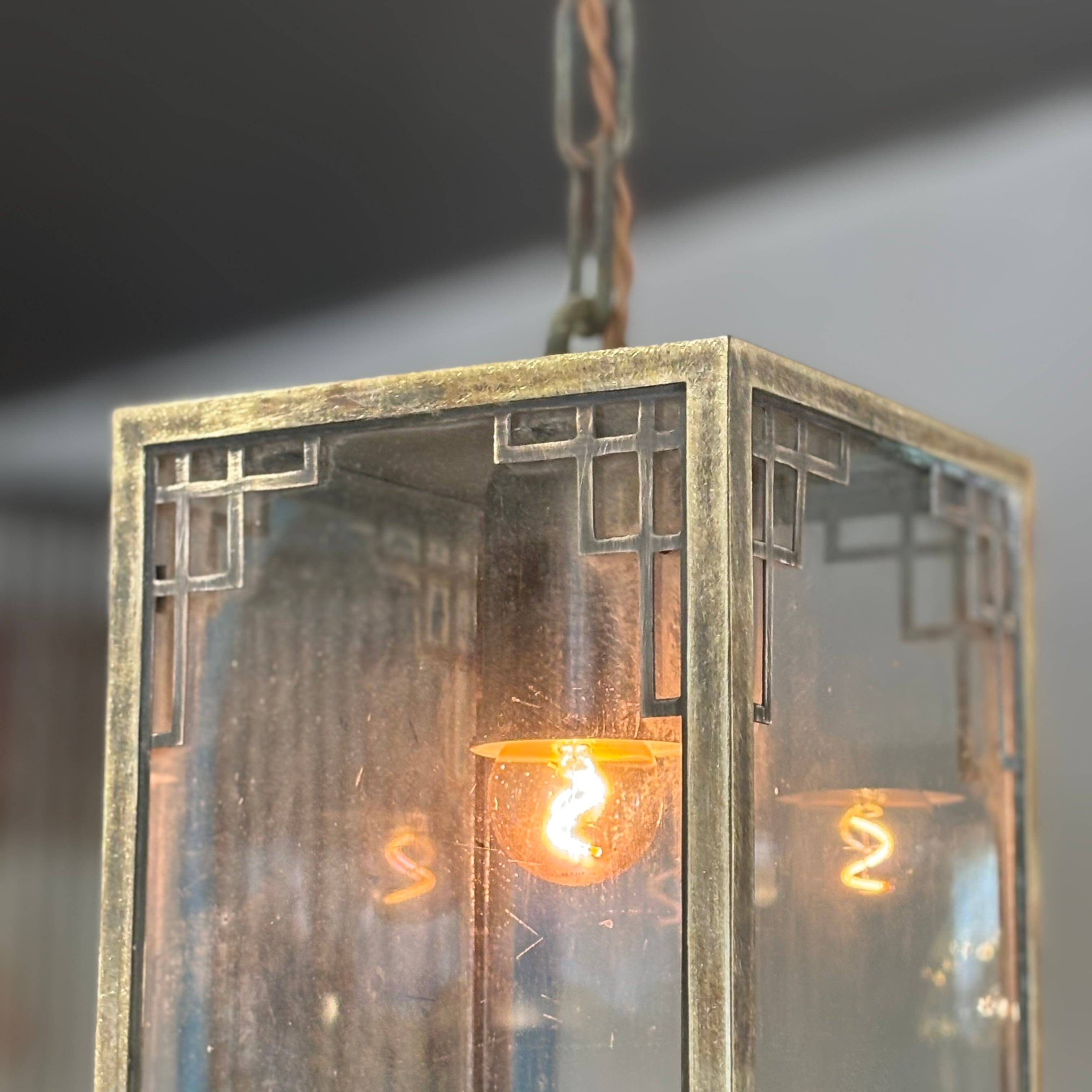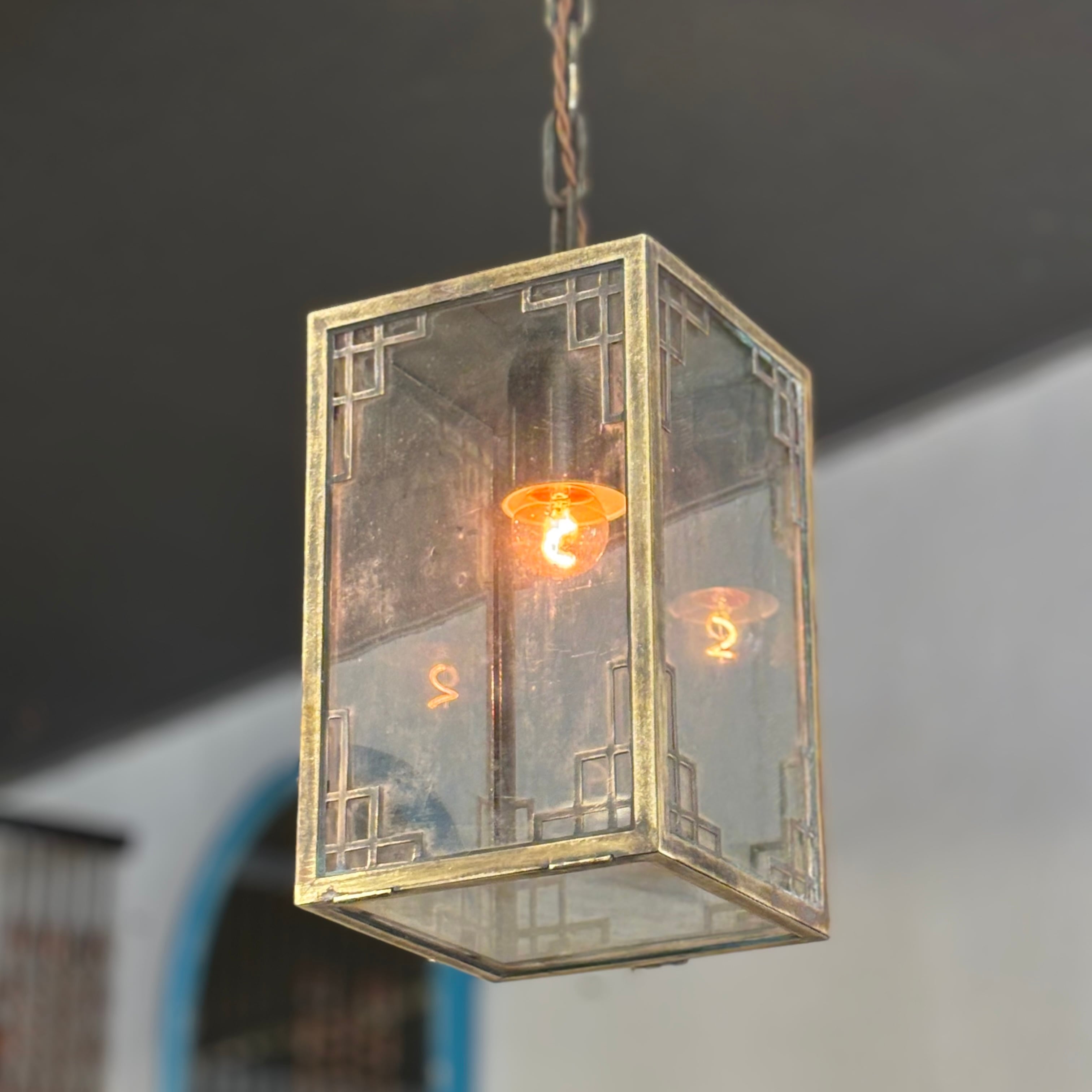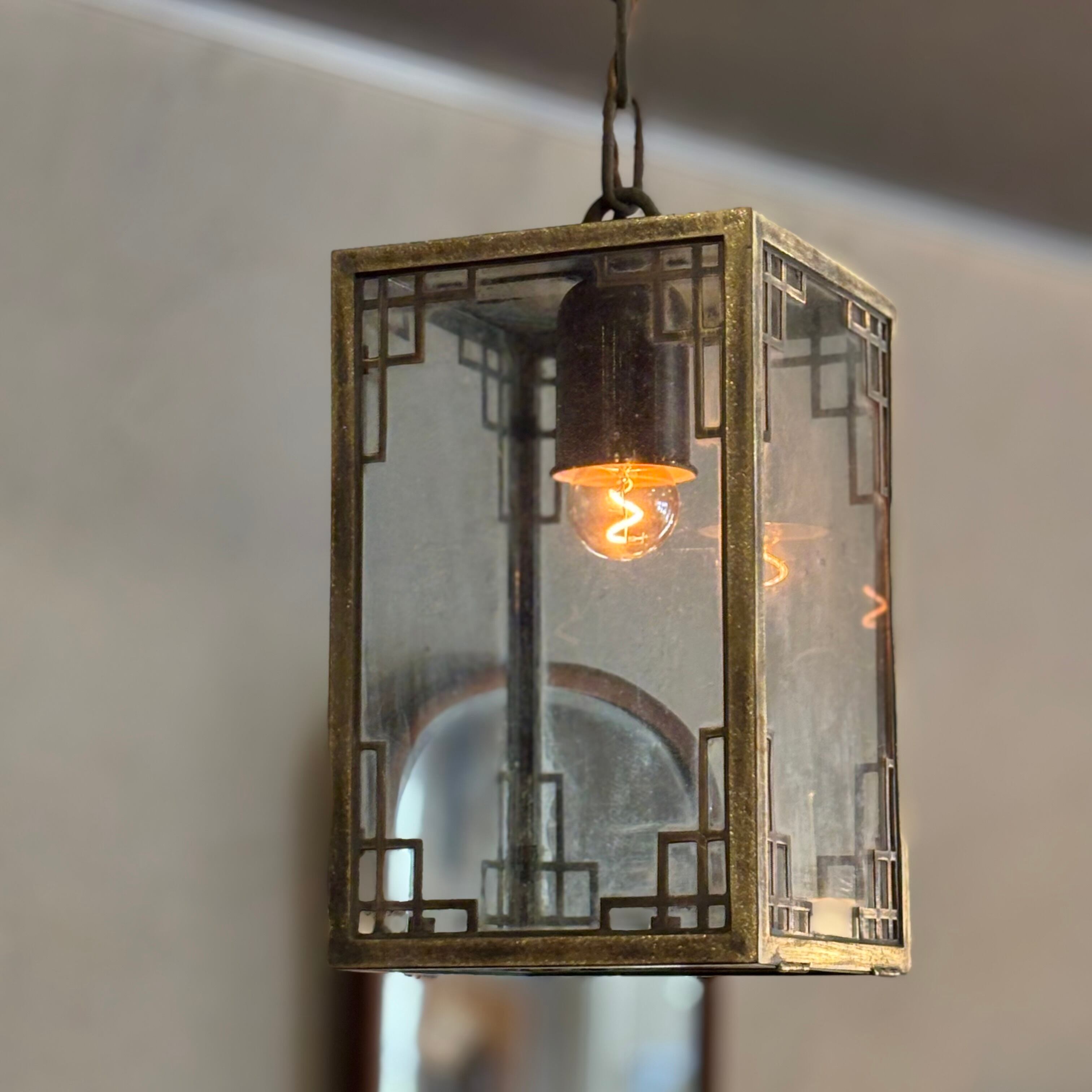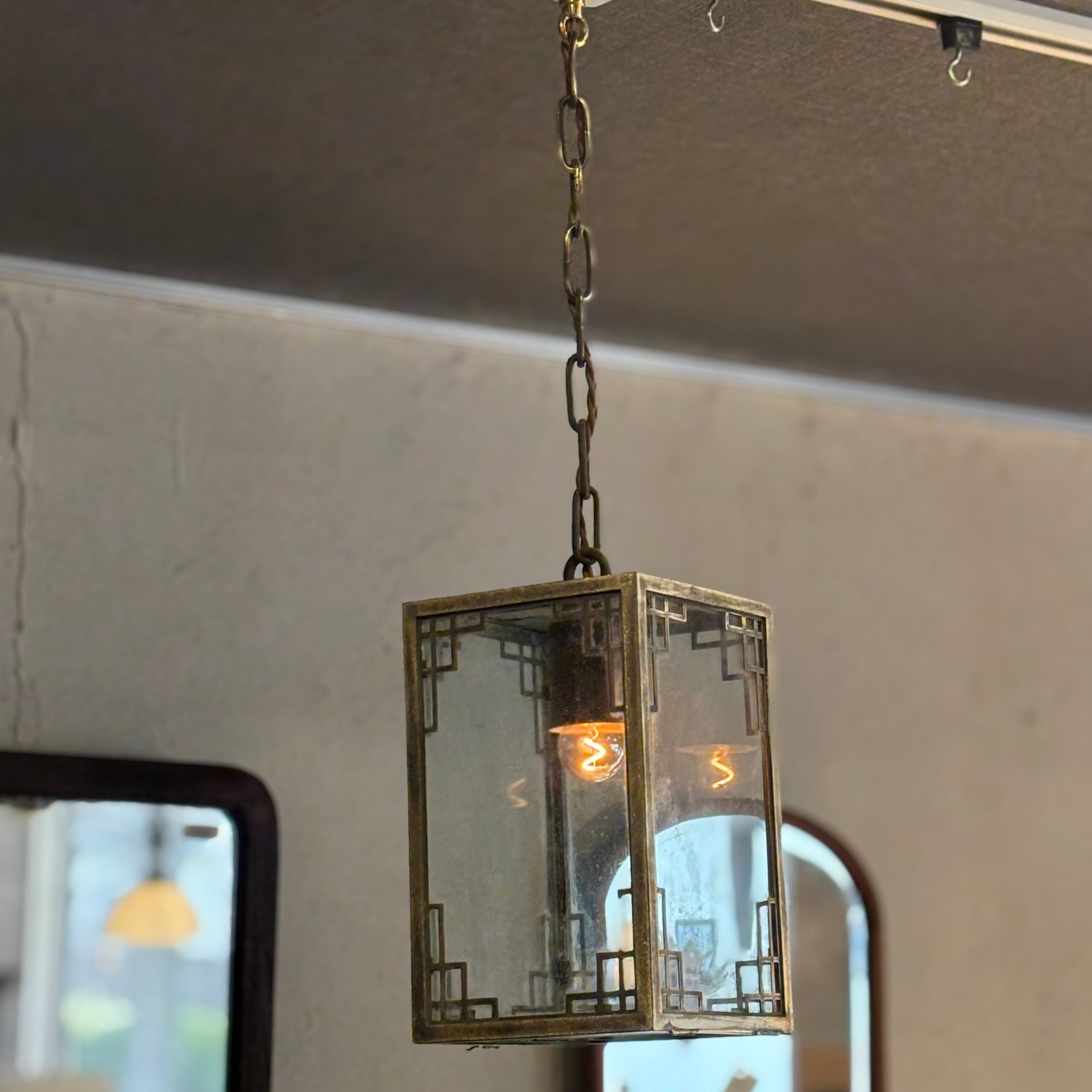 ガラスの行燈のような形 和室にも洋室にも似合うデザイン お店などにも雰囲気が良くなると思います 底が開く仕様になっております 小さなクギを外すと開きます 無くさないようにお気をつけください ガラス行燈サイズ約W152×D155×H240mm 天井からの高さ約610mm LED E26 テスト電球付き