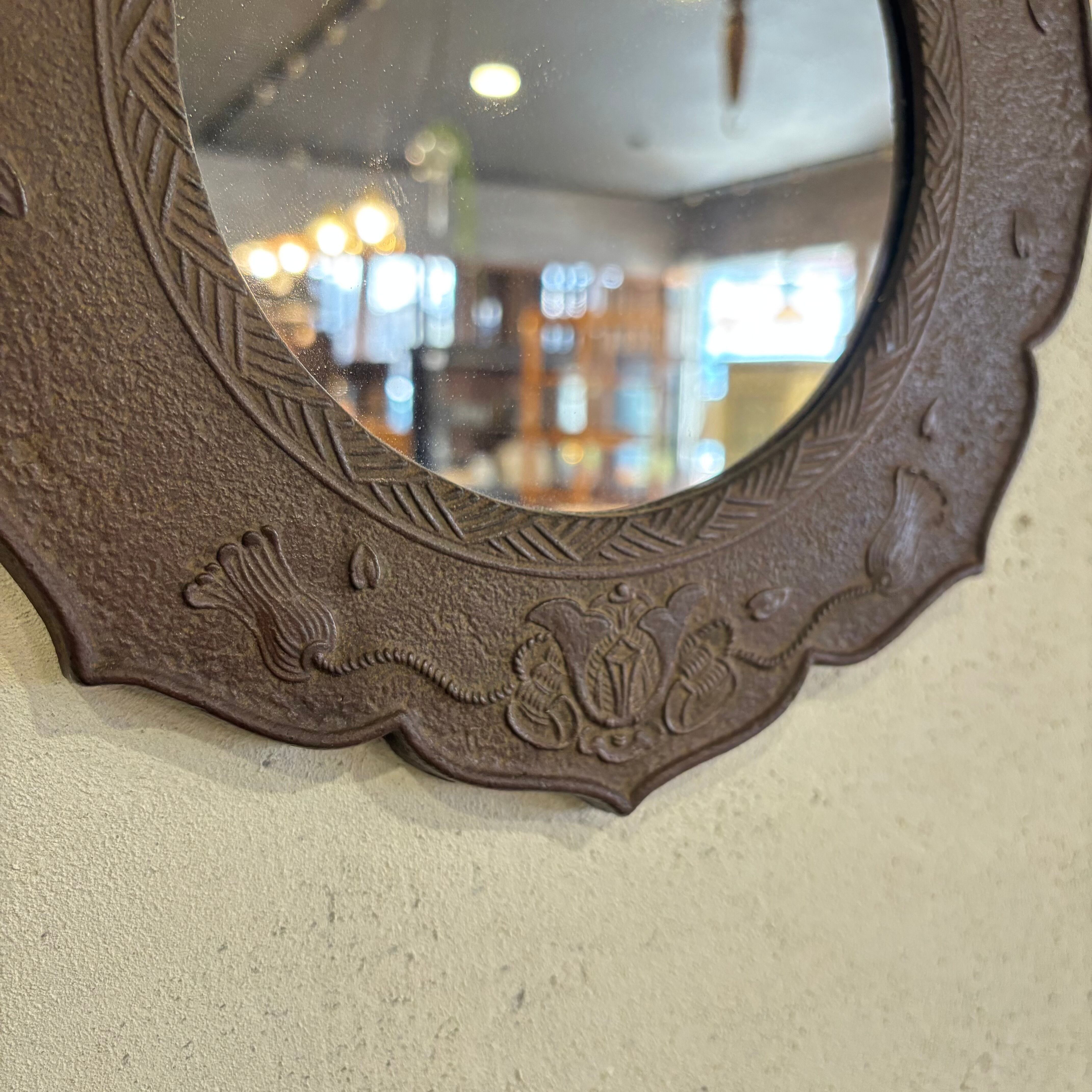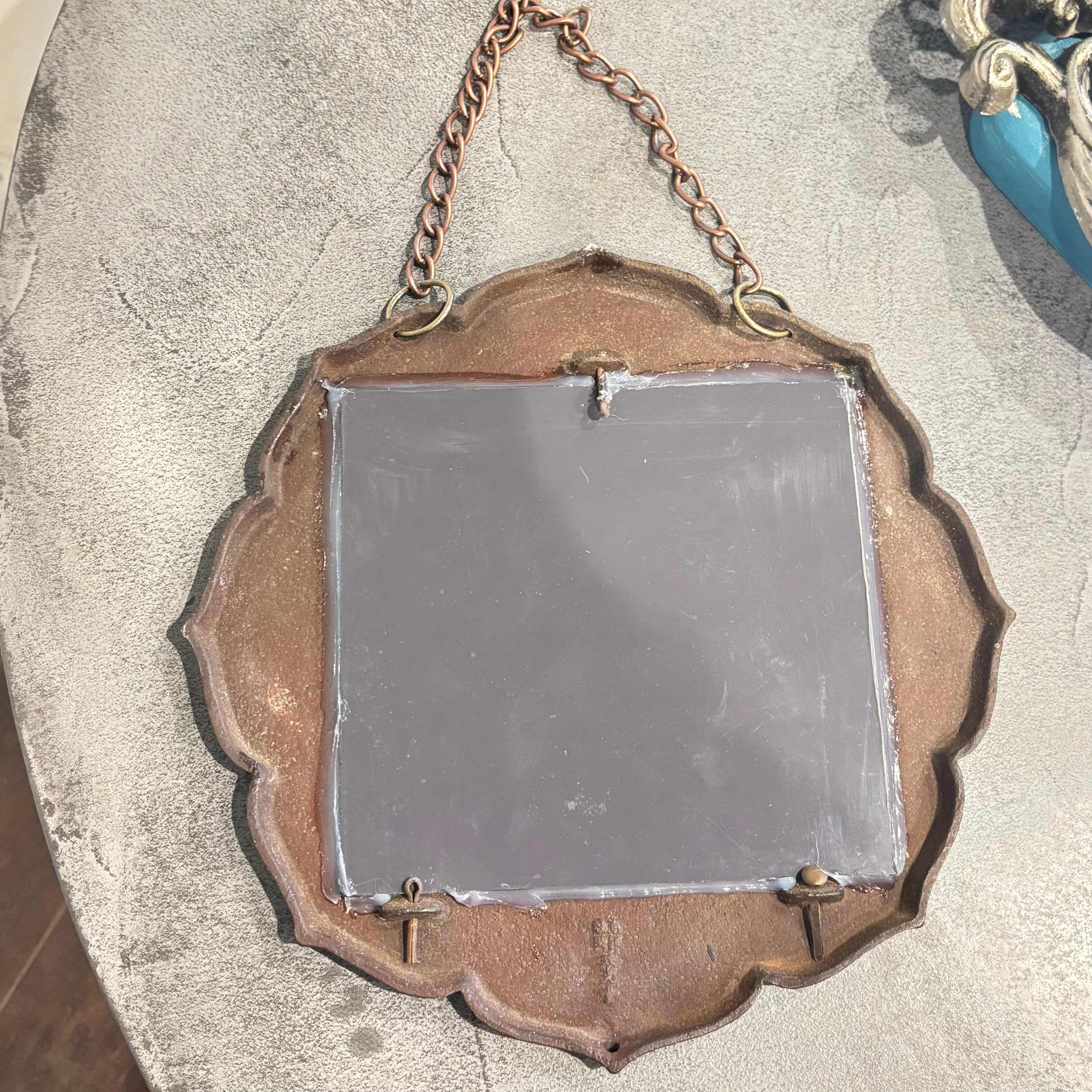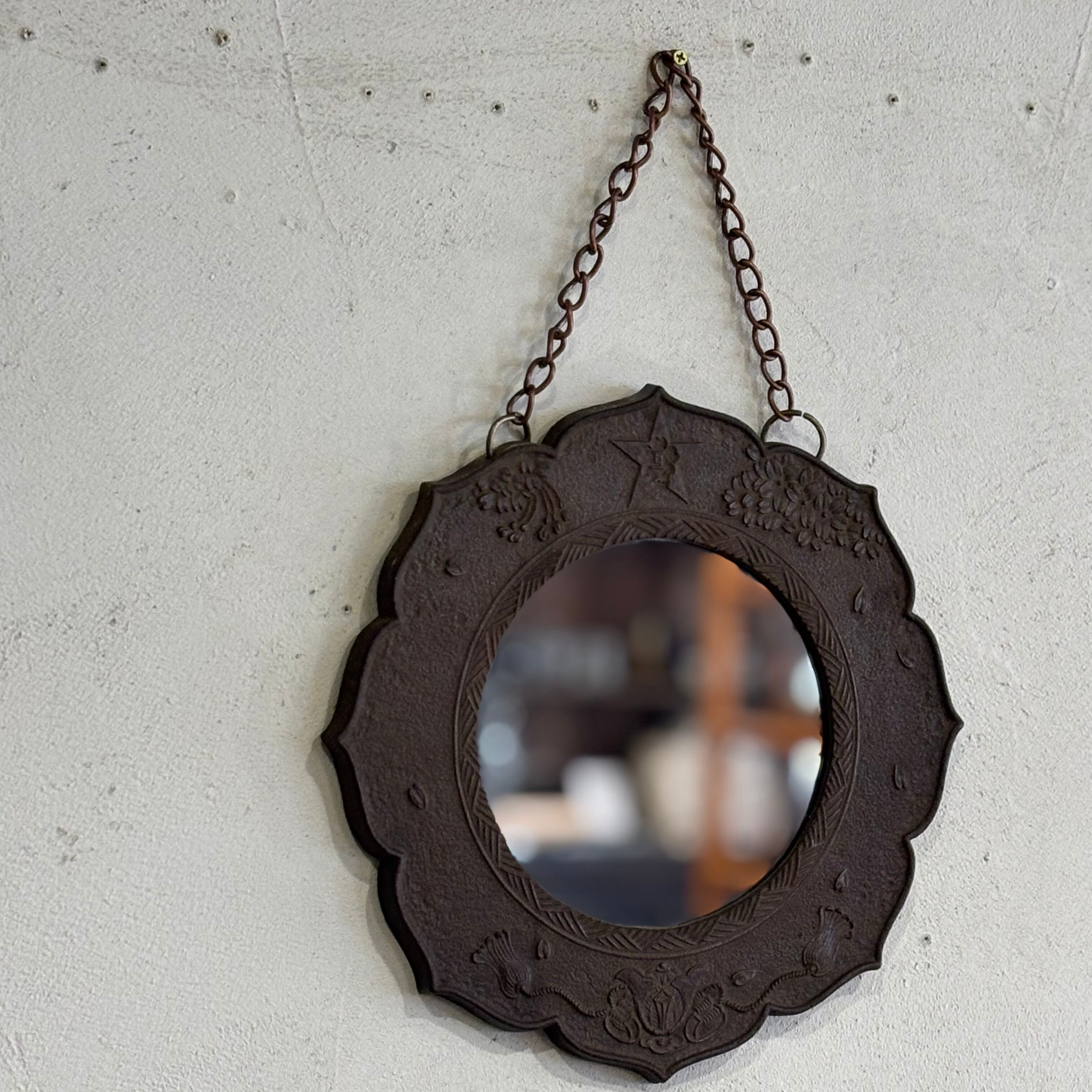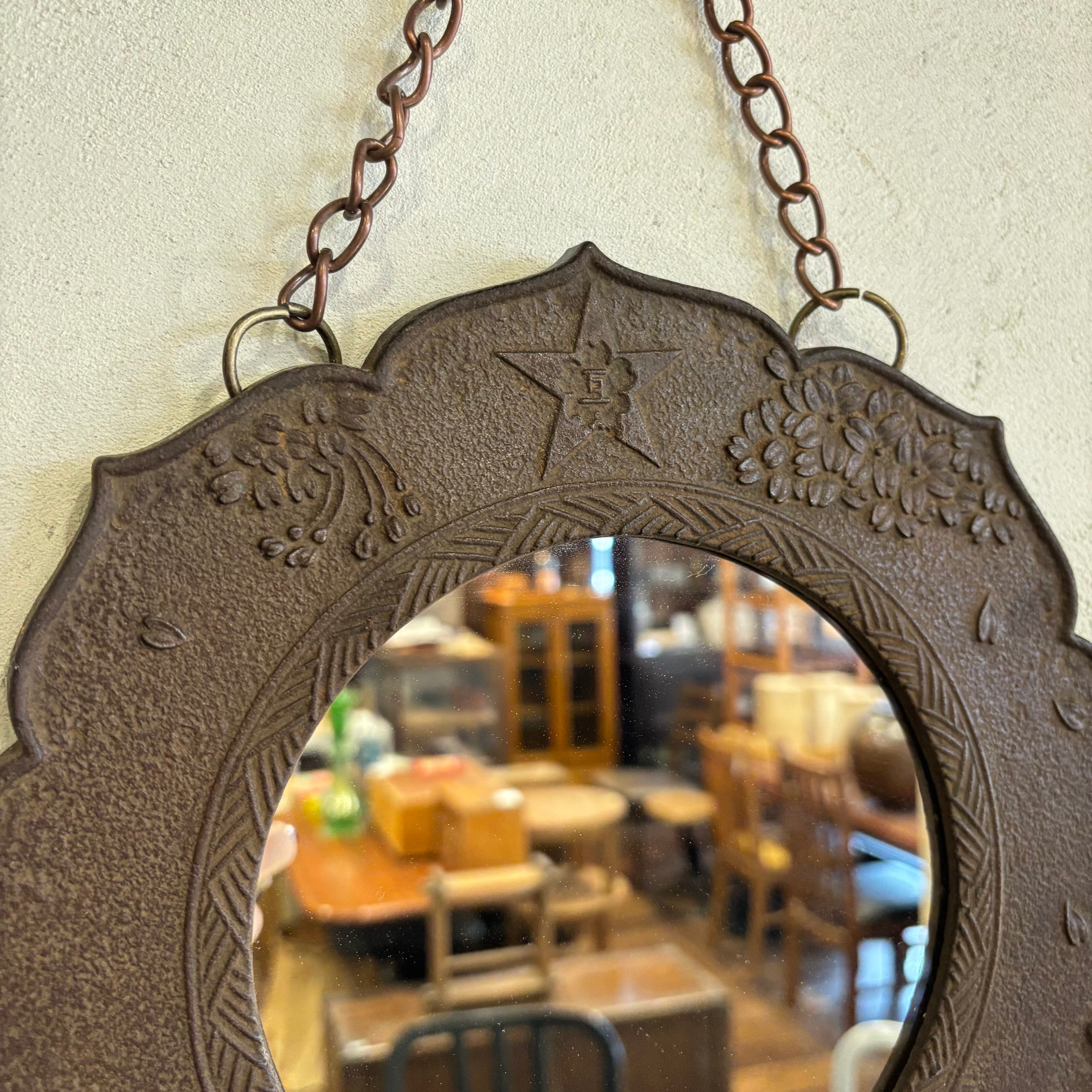 古い金属製の枠にミラーをはめ込みました 花や兜などが施されています サイズW270×H270(チェーン含まず)D15mm