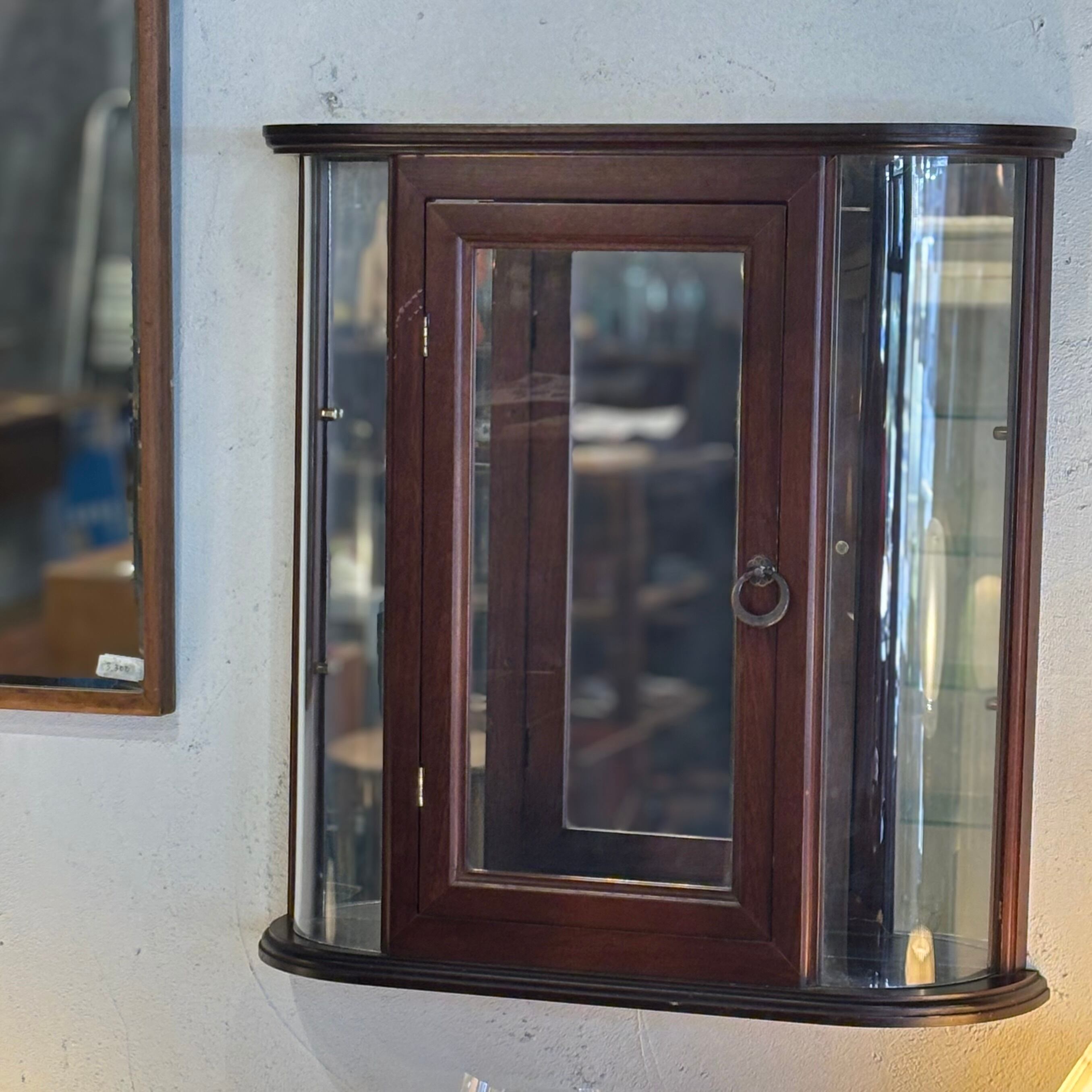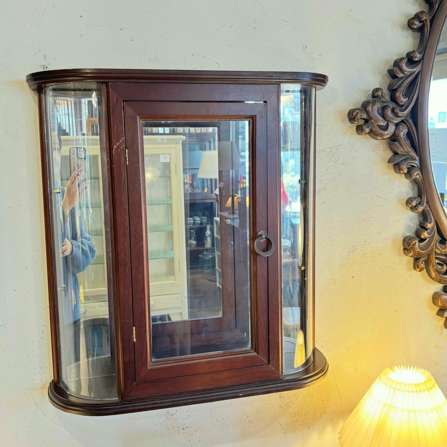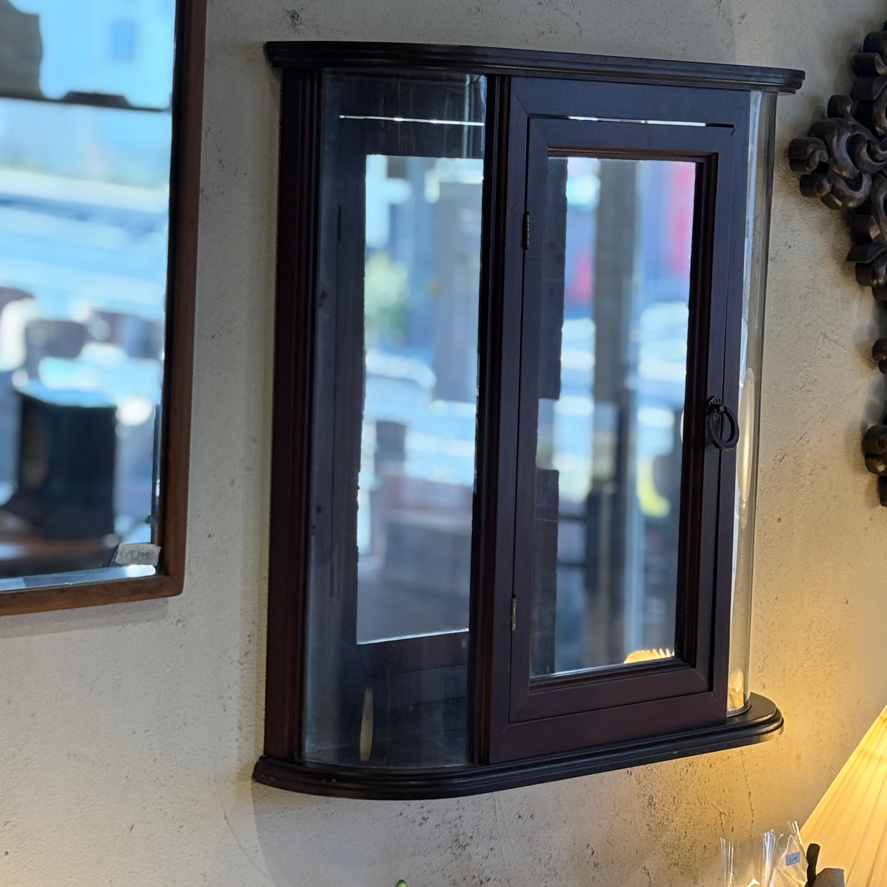 壁掛け収納ミラー 内部にアクセサリーやメガネ、時計など置いていただけます 背部にはフック2つで壁に付くようになっております ドアフックは多少硬めです 古い物なので小傷などございますが雰囲気のいい収納型ミラーです サイズW500×D145×H545mm