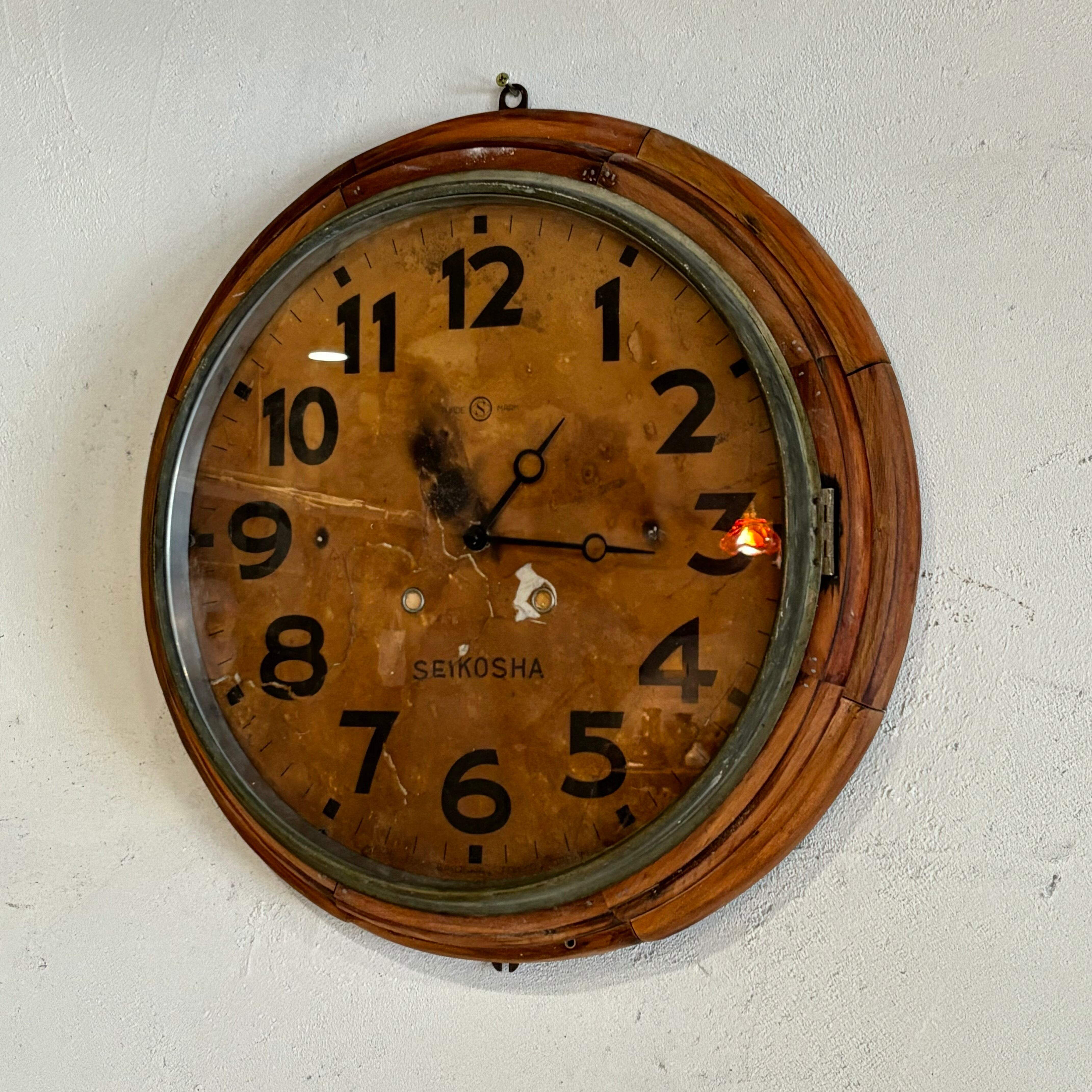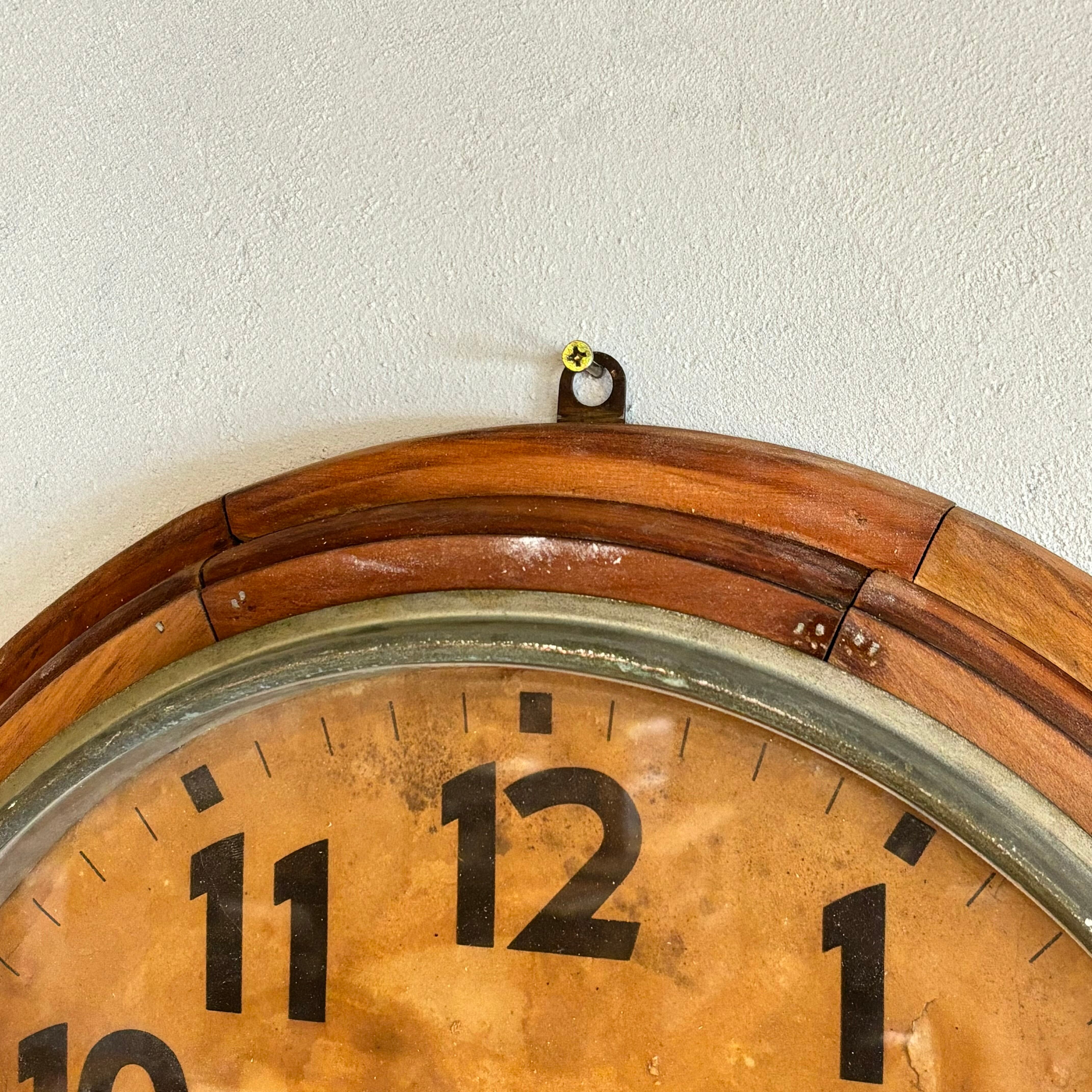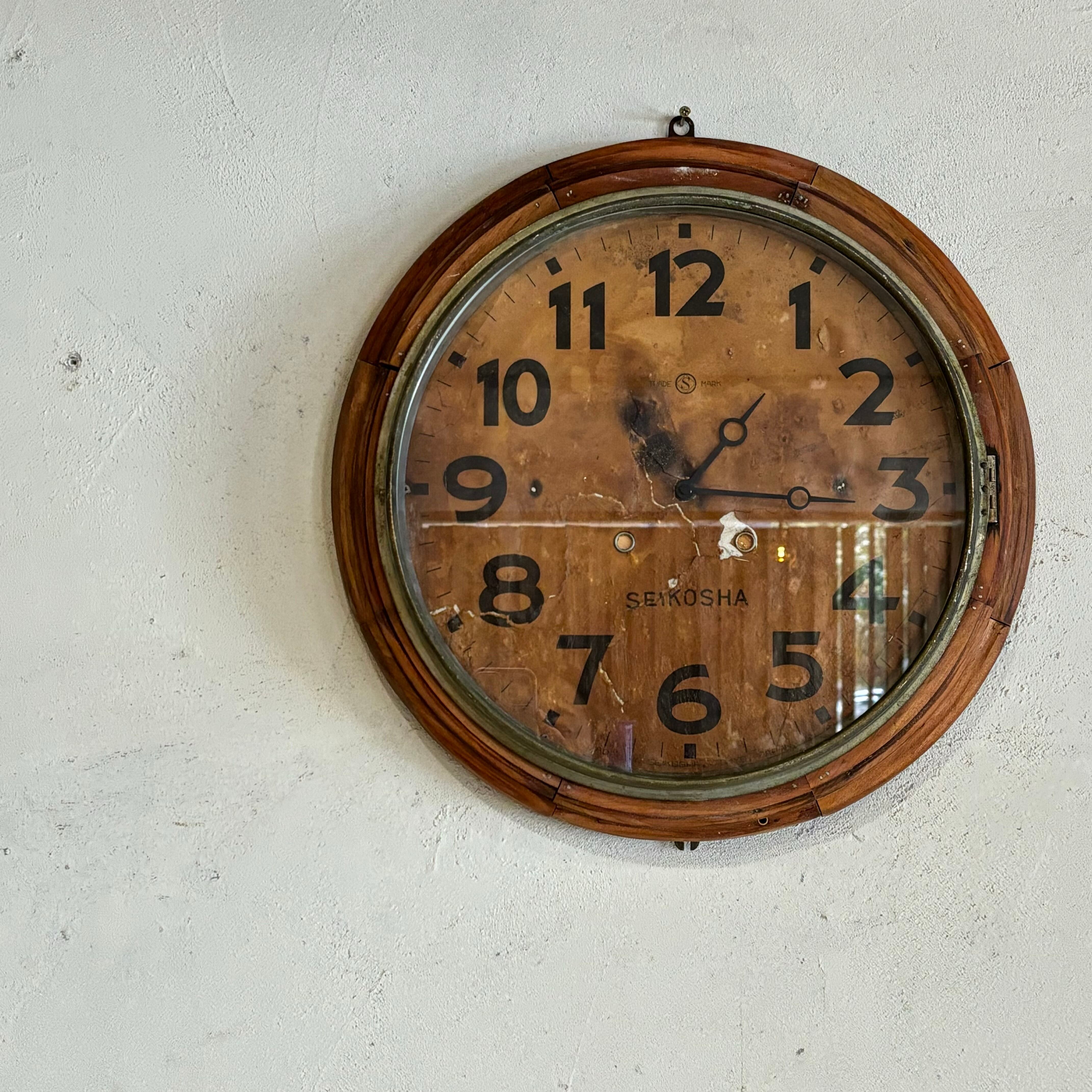 大きな古い掛け時計をリメイク 文字盤と木枠はそのままにガラスを新しく付け替え、ムーブメントと針は新しく交換しております 日焼けした文字盤が雰囲気良く仕上がってます 単三電池1つで作動 サイズ直径約420mm